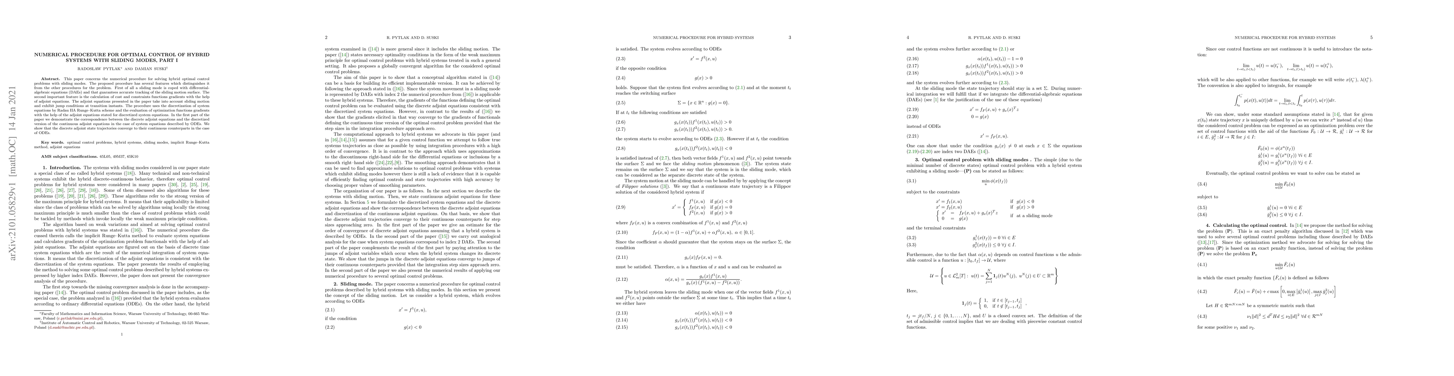 This paper concerns the numerical procedure for solving hybrid optimal control problems with sliding modes. The proposed procedure has several features which distinguishes it from the other procedures for the problem. First of all a sliding mode is coped with differential-algebraic equations (DAEs) and that guarantees accurate tracking of the sliding motion surface. The second important feature is the calculation of cost and constraints functions gradients with the help of adjoint equations. The adjoint equations presented in the paper take into account sliding motion and exhibit jump conditions at transition instants. The procedure uses the discretization of system equations by Radau IIA Runge--Kutta scheme and the evaluation of optimization functions gradients with the help of the adjoint equations stated for discretized system equations. In the first part of the paper we demonstrate the correspondence between the discrete adjoint equations and the discretized version of the continuous adjoint equations in the case of system equations described by ODEs. We show that the discrete adjoint state trajectories converge to their continuous counterparts in the case of ODEs.