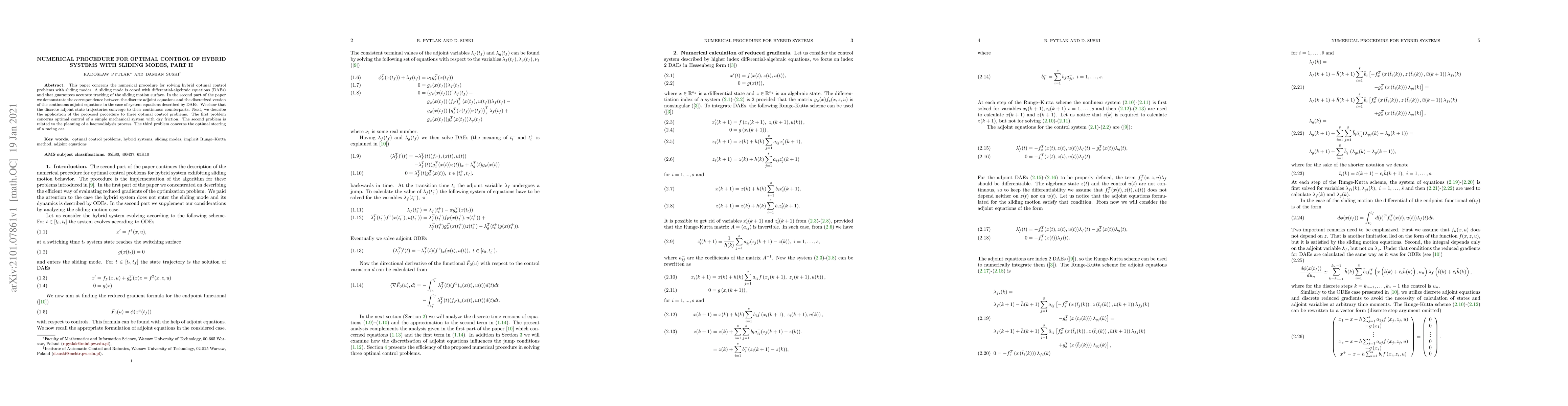 This paper concerns the numerical procedure for solving hybrid optimal control problems with sliding modes. A sliding mode is coped with differential-algebraic equations (DAEs) and that guarantees accurate tracking of the sliding motion surface. In the second part of the paper we demonstrate the correspondence between the discrete adjoint equations and the discretized version of the continuous adjoint equations in the case of system equations described by DAEs. We show that the discrete adjoint state trajectories converge to their continuous counterparts. Next, we describe the application of the proposed procedure to three optimal control problems. The first problem concerns optimal control of a simple mechanical system with dry friction. The second problem is related to the planning of a haemodialysis process. The third problem concerns the optimal steering of a racing car.