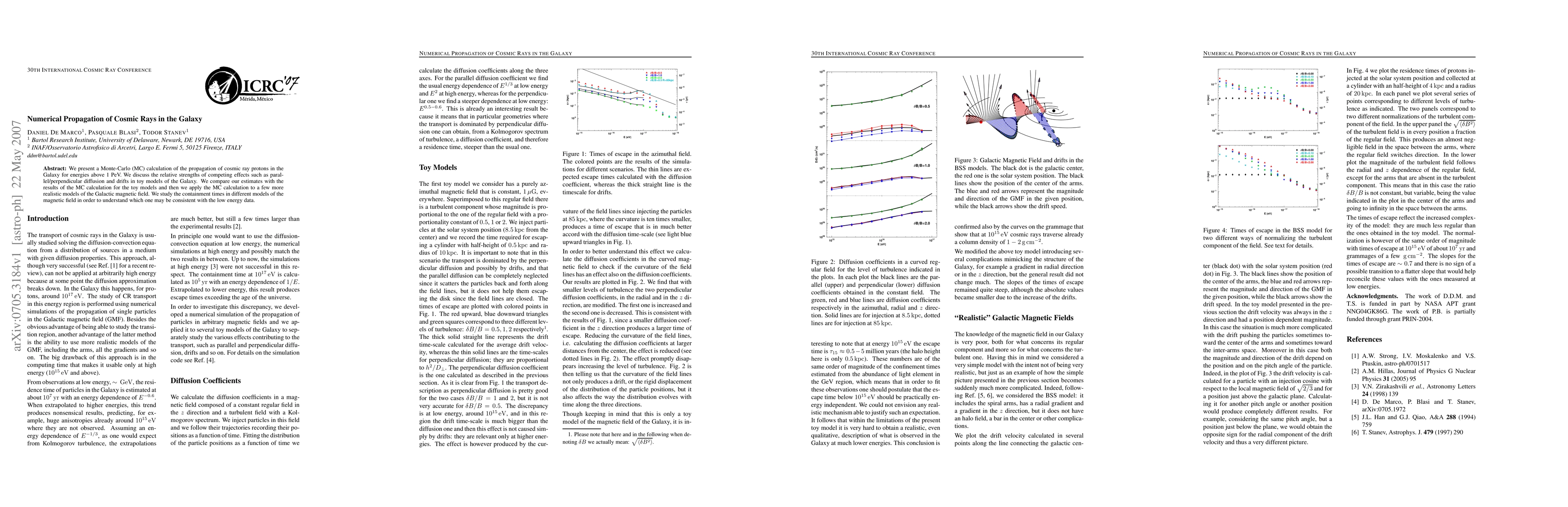 This research employs Monte-Carlo calculations to simulate cosmic ray proton propagation above 1 PeV in the Galaxy. It compares effects like parallel/perpendicular diffusion and drifts in simplified Galaxy models, then applies the method to more realistic magnetic field models to investigate containment times, aiming to reconcile with low-energy data.