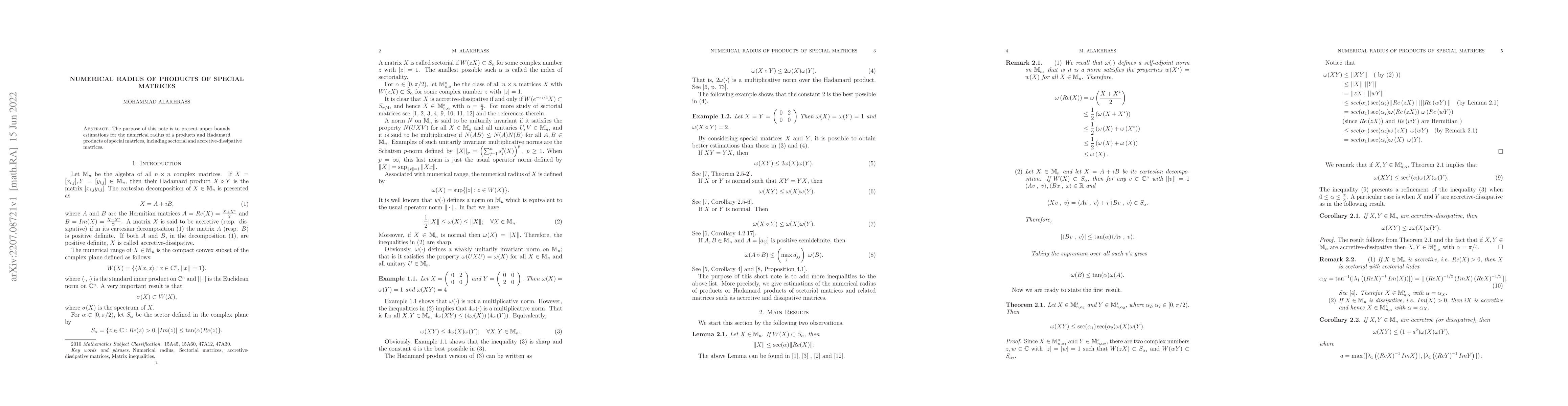 Summary: This paper provides upper bound estimations for the numerical radius of products and Hadamard products of special matrices, such as sectorial and accretive-dissipative matrices, enhancing the understanding of their numerical properties.