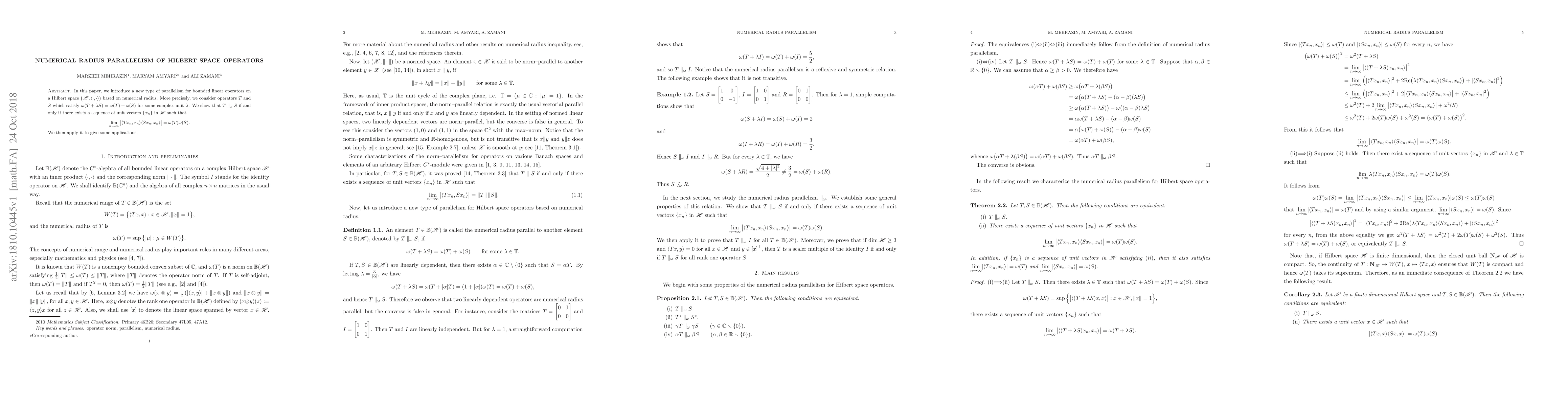 In this paper, we introduce a new type of parallelism for bounded linear operators on a Hilbert space $\big(\mathscr{H}, \langle \cdot ,\cdot \rangle\big)$ based on numerical radius. More precisely, we consider operators $T$ and $S$ which satisfy $\omega(T + \lambda S) = \omega(T)+\omega(S)$ for some complex unit $\lambda$. We show that $T \parallel_{\omega} S$ if and only if there exists a sequence of unit vectors $\{x_n\}$ in $\mathscr{H}$ such that \begin{align*} \lim_{n\rightarrow\infty} \big|\langle Tx_n, x_n\rangle\langle Sx_n, x_n\rangle\big| = \omega(T)\omega(S). \end{align*} We then apply it to give some applications.