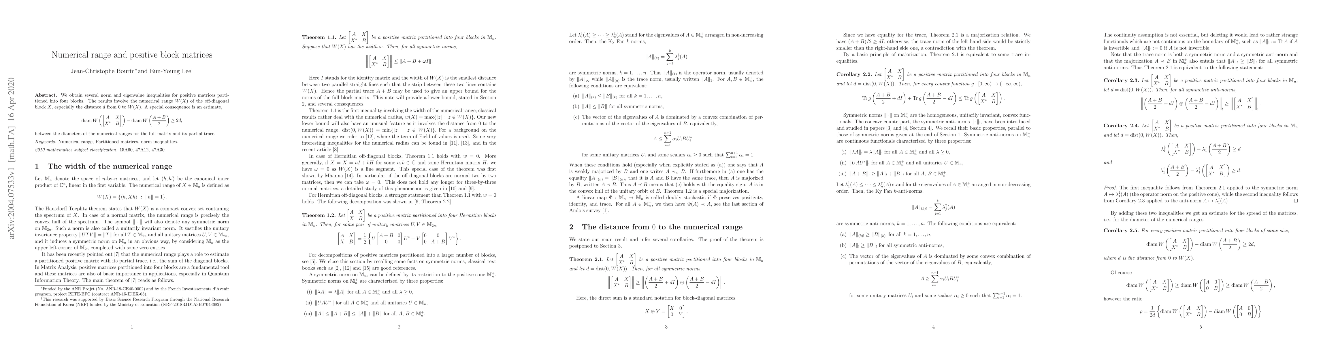 Summary: This paper presents norm and eigenvalue inequalities for positive block matrices partitioned into four blocks, focusing on the numerical range of the off-diagonal block X, particularly the distance from 0 to W(X). These results enhance the understanding of the properties of such partitioned matrices.