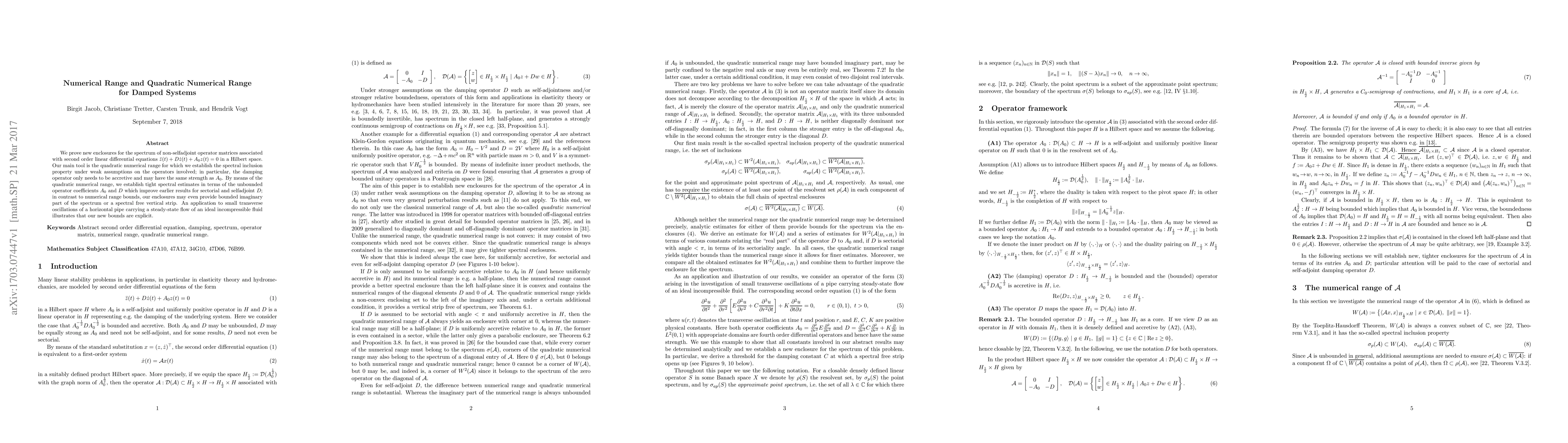 We prove new enclosures for the spectrum of non-selfadjoint operator matrices associated with second order linear differential equations $\ddot{z}(t) + D \dot{z} (t) + A_0 z(t) = 0$ in a Hilbert space. Our main tool is the quadratic numerical range for which we establish the spectral inclusion property under weak assumptions on the operators involved; in particular, the damping operator only needs to be accretive and may have the same strength as $A_0$. By means of the quadratic numerical range, we establish tight spectral estimates in terms of the unbounded operator coefficients $A_0$ and $D$ which improve earlier results for sectorial and selfadjoint $D$; in contrast to numerical range bounds, our enclosures may even provide bounded imaginary part of the spectrum or a spectral free vertical strip. An application to small transverse oscillations of a horizontal pipe carrying a steady-state flow of an ideal incompressible fluid illustrates that our new bounds are explicit.