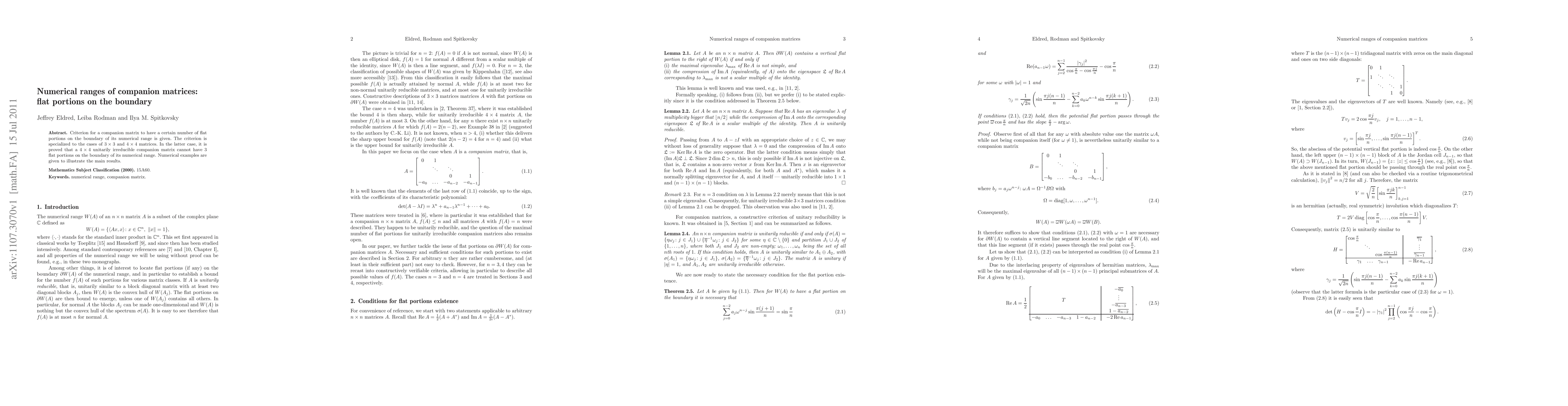 Criterion for a companion matrix to have a certain number of flat portions on the boundary of its numerical range is given. The criterion is specialized to the cases of 3-by-3 and 4-by-4 matrices. In the latter case, it is proved that a 4-by-4 unitarily irreducible companion matrix cannot have 3 flat portions on the boundary of its numerical range. Numerical examples are given to illustrate the main results.