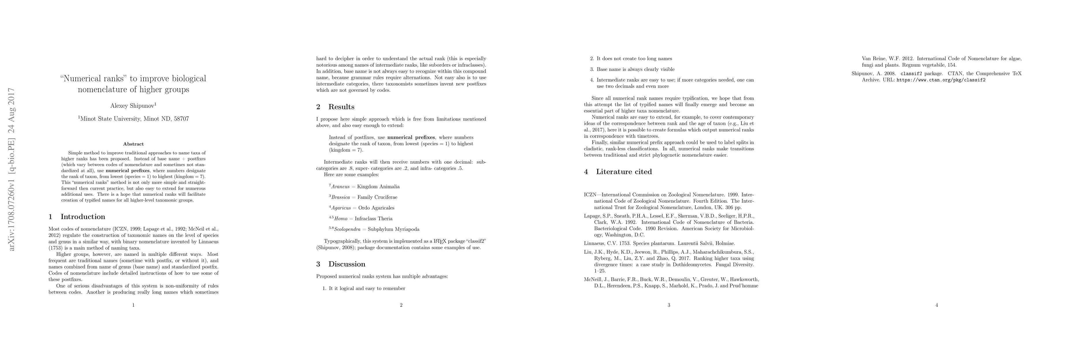 Simple method to improve traditional approaches to name taxa of higher ranks has been proposed. Instead of base name + postfixes (which vary between codes of nomenclature and sometimes not standardized at all), use numerical prefixes, where numbers designate the rank of taxon, from lowest (species = 1) to highest (kingdom = 7). This "numerical ranks" method is not only more simple and straightforward then current practice, but also easy to extend for numerous additional uses. There is a hope that numerical ranks will facilitate creation of typified names for all higher-level taxomonic groups.