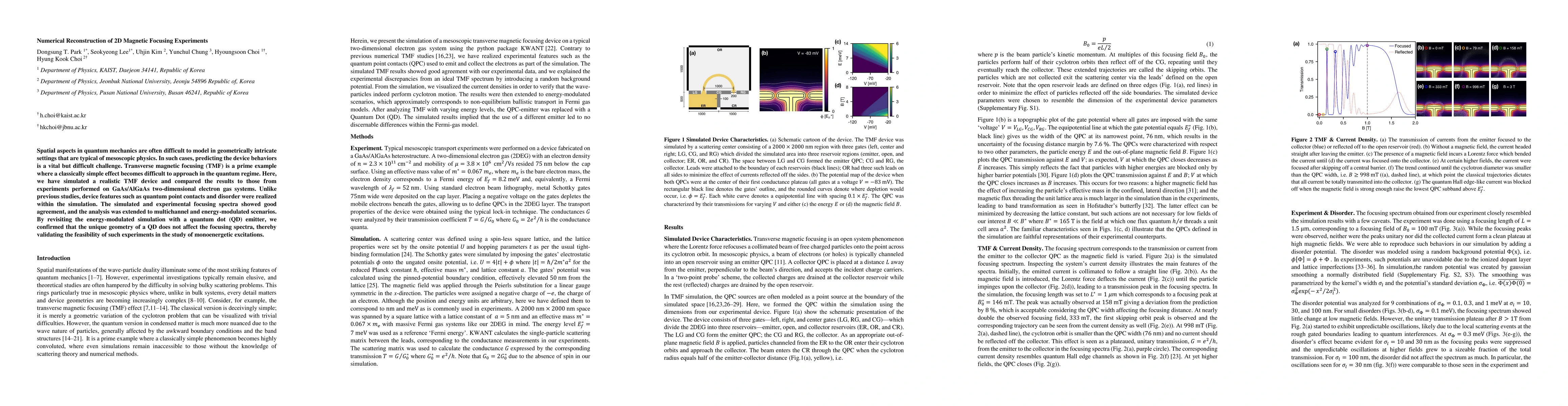 Spatial aspects in quantum mechanics are often difficult to model in geometrically intricate settings that are typical of mesoscopic physics. In such cases, predicting the device behaviors is a vital but difficult challenge. Transverse magnetic focusing (TMF) is a prime example where a classically simple effect becomes difficult to approach in the quantum regime. Here, we have simulated a realistic TMF device and compared the results to those from experiments performed on GaAs/AlGaAs two-dimensional electron gas systems. Unlike previous studies, device features such as quantum point contacts and disorder were realized within the simulation. The simulated and experimental focusing spectra showed good agreement, and the analysis was extended to multichannel and energy-modulated scenarios. By revisiting the energy-modulated simulation with a quantum dot (QD) emitter, we confirmed that the unique geometry of a QD does not affect the focusing spectra, thereby validating the feasibility of such experiments in the study of monoenergetic excitations.