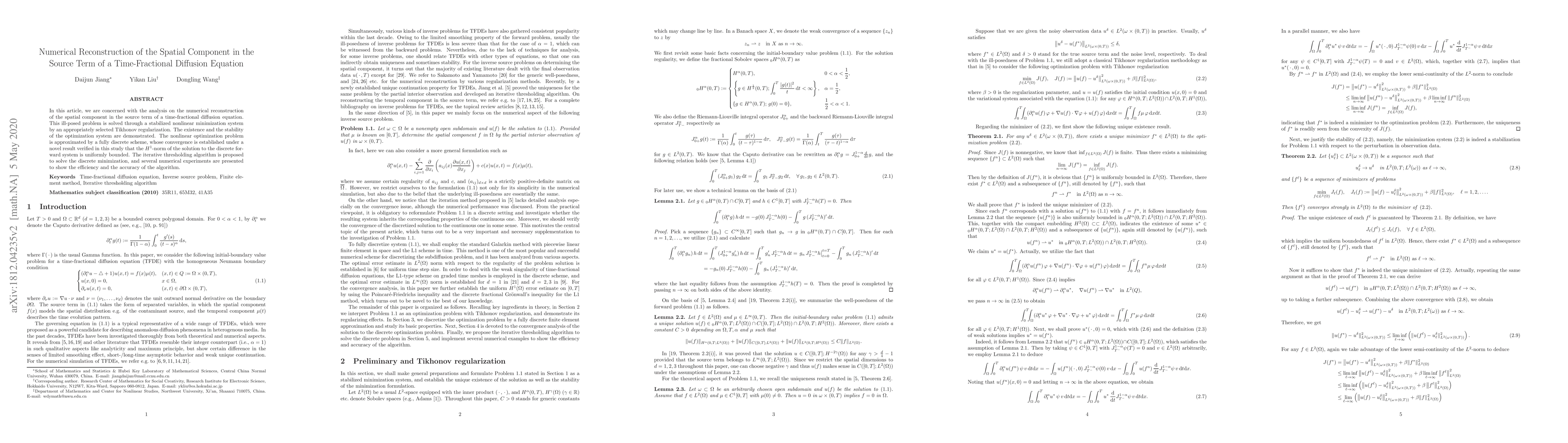 This paper presents a method for numerically reconstructing the spatial component in the source term of a time-fractional diffusion equation using a stabilized nonlinear minimization system with Tikhonov regularization. The proposed iterative thresholding algorithm demonstrates efficiency and accuracy through numerical experiments.
