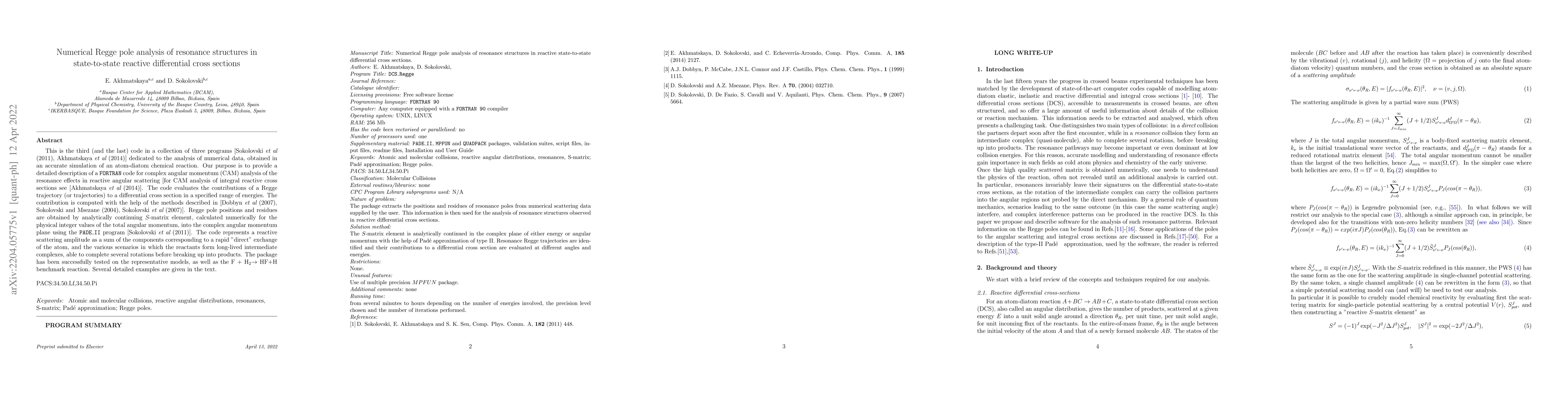 Researchers developed a FORTRAN code to analyze resonance structures in reactive differential cross sections using Regge pole analysis, providing insight into chemical reaction mechanisms.