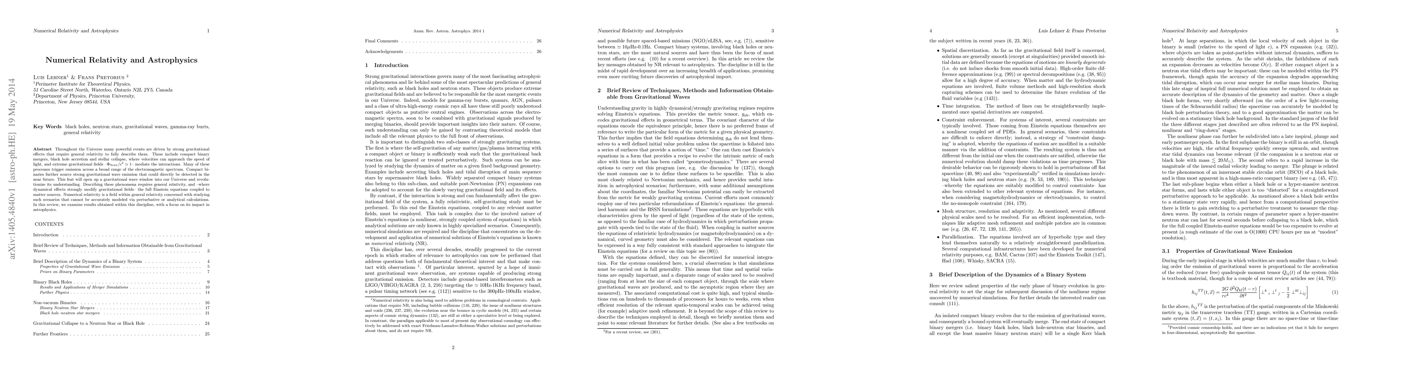 Throughout the Universe many powerful events are driven by strong gravitational effects that require general relativity to fully describe them. These include compact binary mergers, black hole accretion and stellar collapse, where velocities can approach the speed of light, and extreme gravitational fields --$\Phi_{\rm Newt}/c^2 \simeq 1$-- mediate the interactions. Many of these processes trigger emission across a broad range of the electromagnetic spectrum. Compact binaries further source strong gravitational wave emission that could directly be detected in the near future. This feat will open up a gravitational wave window into our Universe and revolutionize its understanding. Describing these phenomena requires general relativity, and --where dynamical effects strongly modify gravitational fields-- the full Einstein equations coupled to matter sources. Numerical relativity is a field within general relativity concerned with studying such scenarios that cannot be accurately modeled via perturbative or analytical calculations. In this review, we examine results obtained within this discipline, with a focus on its impact in astrophysics.