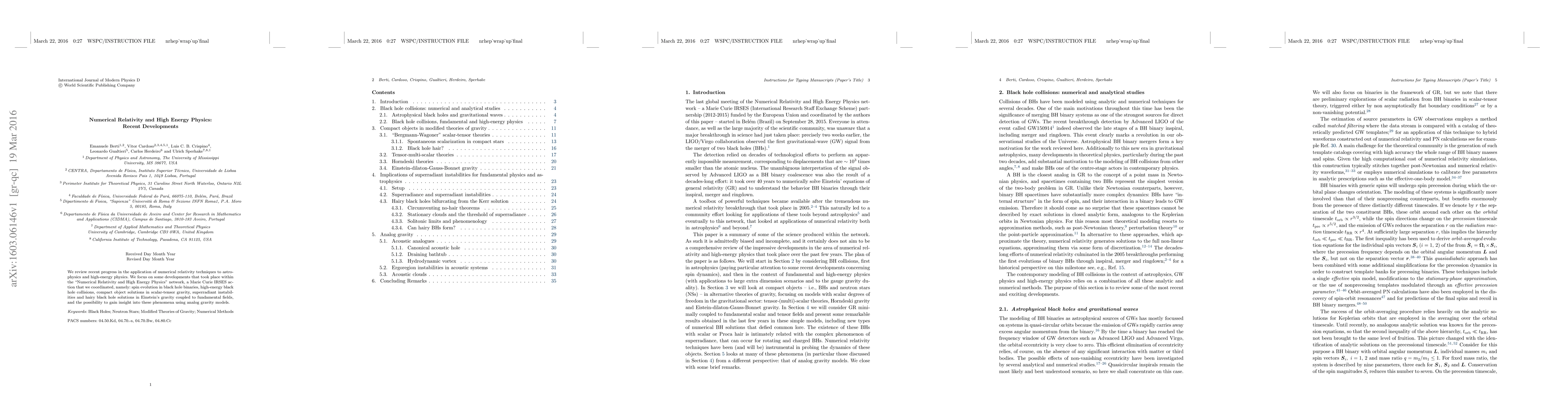 We review recent progress in the application of numerical relativity techniques to astrophysics and high-energy physics. We focus on some developments that took place within the "Numerical Relativity and High Energy Physics" network, a Marie Curie IRSES action that we coordinated, namely: spin evolution in black hole binaries, high-energy black hole collisions, compact object solutions in scalar-tensor gravity, superradiant instabilities and hairy black hole solutions in Einstein's gravity coupled to fundamental fields, and the possibility to gain insight into these phenomena using analog gravity models.