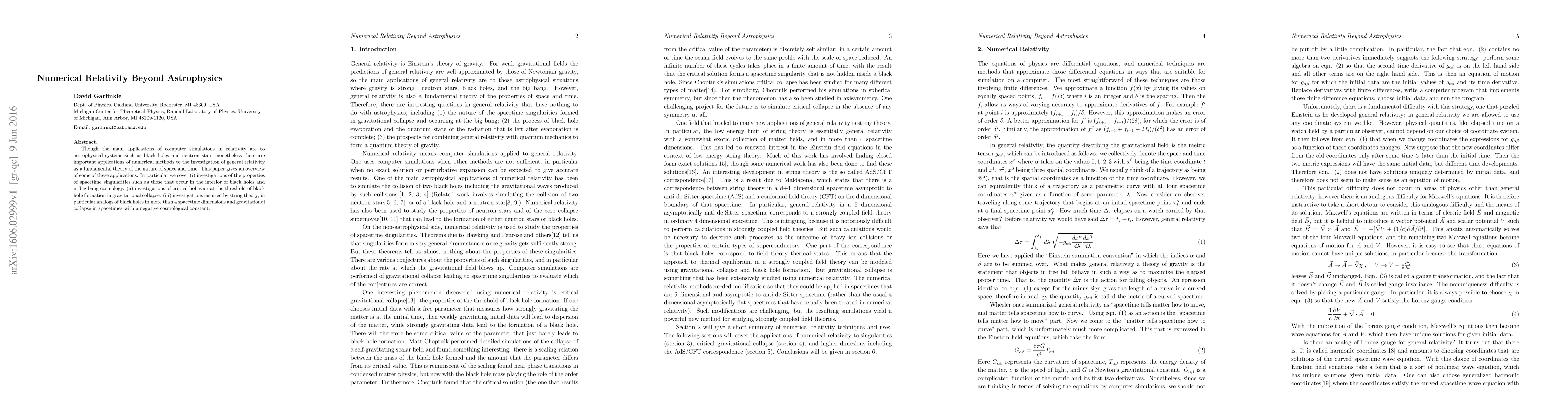 This paper explores the applications of numerical relativity beyond astrophysics, focusing on fundamental investigations of general relativity. It covers studies on spacetime singularities, critical behavior at black hole formation, and theoretical explorations inspired by string theory, including higher-dimensional black holes and gravitational collapse in negatively curved spacetimes.