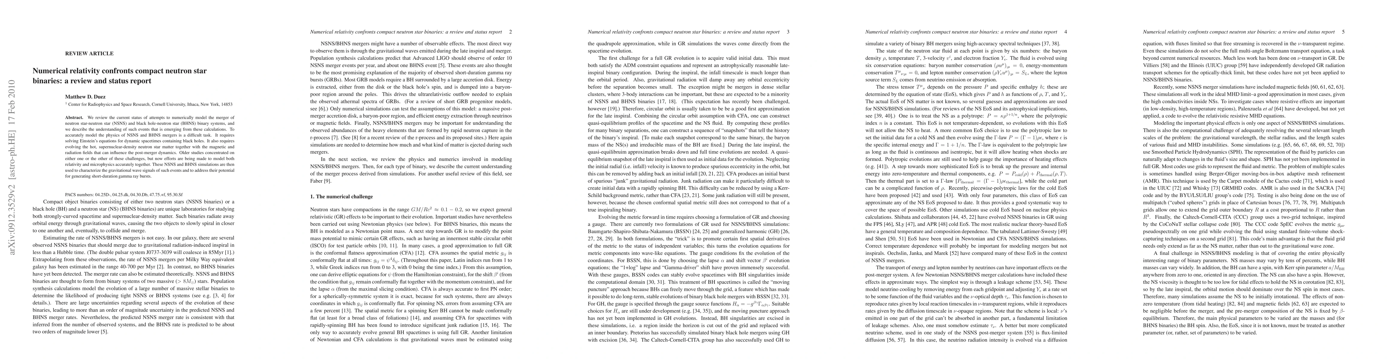 We review the current status of attempts to numerically model the merger of neutron star-neutron star (NSNS) and black hole-neutron star (BHNS) binary systems, and we describe the understanding of such events that is emerging from these calculations. To accurately model the physics of NSNS and BHNS mergers is a difficult task. It requires solving Einstein's equations for dynamic spacetimes containing black holes. It also requires evolving the hot, supernuclear-density neutron star matter together with the magnetic and radiation fields that can influence the post-merger dynamics. Older studies concentrated on either one or the other of these challenges, but now efforts are being made to model both relativity and microphysics accurately together. These NSNS and BHNS simulations are then used to characterize the gravitational wave signals of such events and to address their potential for generating short-duration gamma ray bursts.
