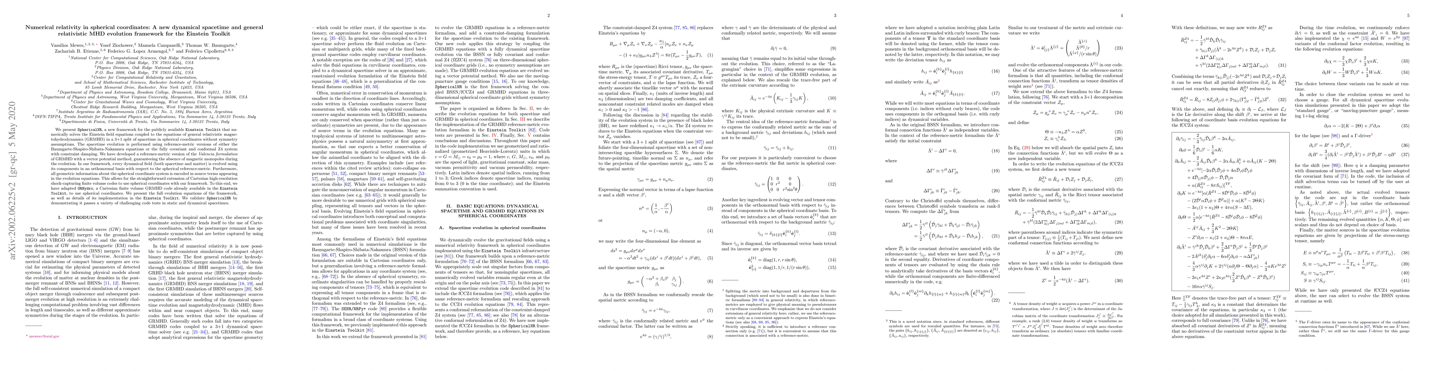 This paper introduces SphericalNR, a new framework within the Einstein Toolkit that solves the Einstein field equations coupled with general relativistic magnetohydrodynamics in spherical coordinates. It employs reference-metric versions of the Baumgarte-Shapiro-Shibata-Nakamura equations or the Z4 system for spacetime evolution, and validates the framework through various code tests.