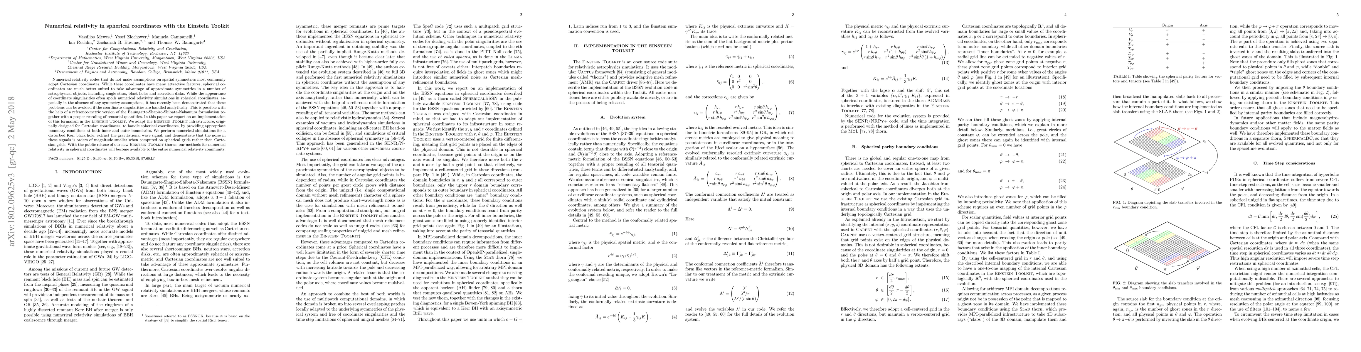 This paper presents an implementation of numerical relativity in spherical coordinates within the Einstein Toolkit, addressing coordinate singularities through analytical methods. The new approach significantly reduces noise in gravitational wave signals compared to Cartesian coordinates, demonstrating the benefits of spherical symmetry in astrophysical simulations.
