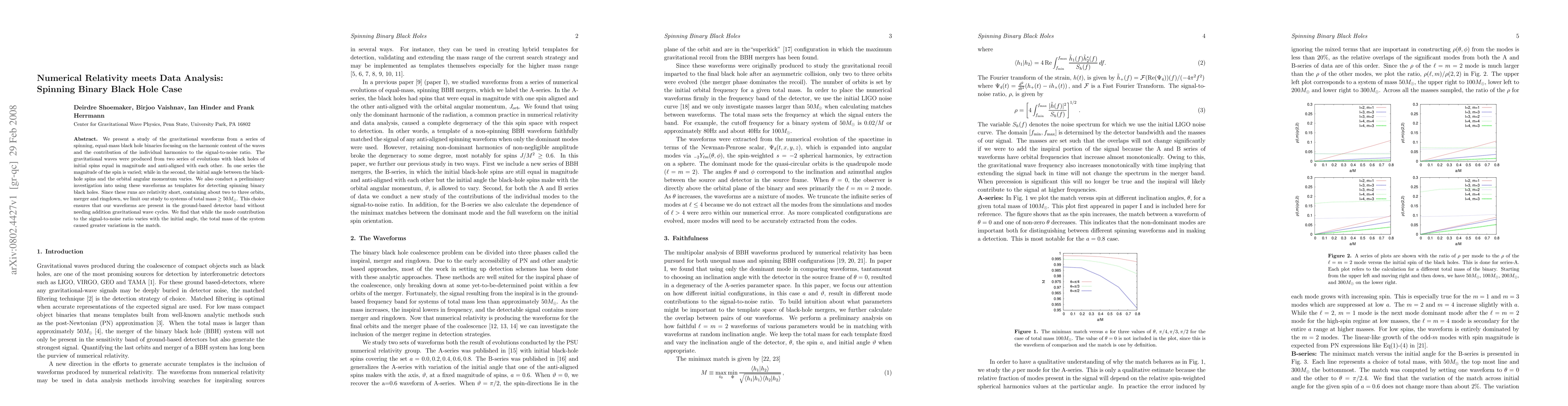 We present a study of the gravitational waveforms from a series of spinning, equal-mass black hole binaries focusing on the harmonic content of the waves and the contribution of the individual harmonics to the signal-to-noise ratio. The gravitational waves were produced from two series of evolutions with black holes of initial spins equal in magnitude and anti-aligned with each other. In one series the magnitude of the spin is varied; while in the second, the initial angle between the black-hole spins and the orbital angular momentum varies. We also conduct a preliminary investigation into using these waveforms as templates for detecting spinning binary black holes. Since these runs are relativity short, containing about two to three orbits, merger and ringdown, we limit our study to systems of total mass greater than 50 solar masses. This choice ensures that our waveforms are present in the ground-based detector band without needing addition gravitational wave cycles. We find that while the mode contribution to the signal-to-noise ratio varies with the initial angle, the total mass of the system caused greater variations in the match.