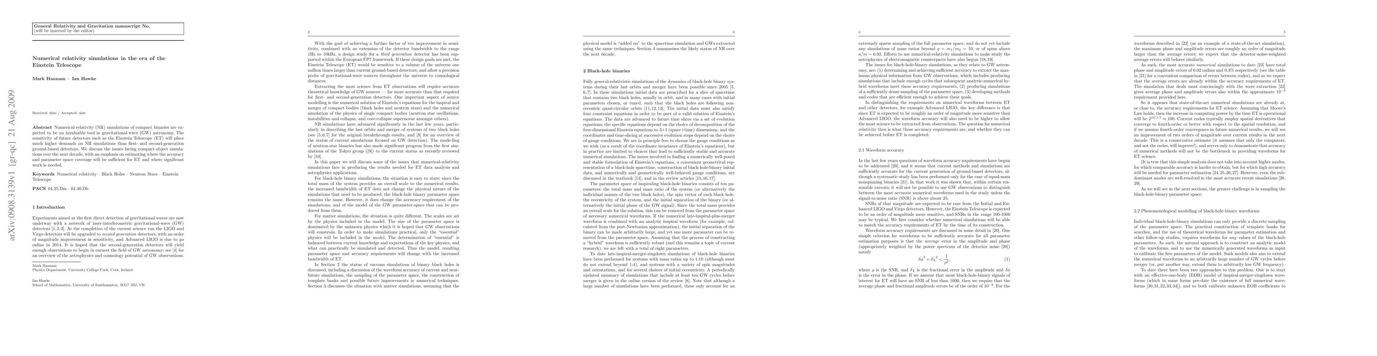 Numerical-relativity (NR) simulations of compact binaries are expected to be an invaluable tool in gravitational-wave (GW) astronomy. The sensitivity of future detectors such as the Einstein Telescope (ET) will place much higher demands on NR simulations than first- and second-generation ground-based detectors. We discuss the issues facing compact-object simulations over the next decade, with an emphasis on estimating where the accuracy and parameter space coverage will be sufficient for ET and where significant work is needed.