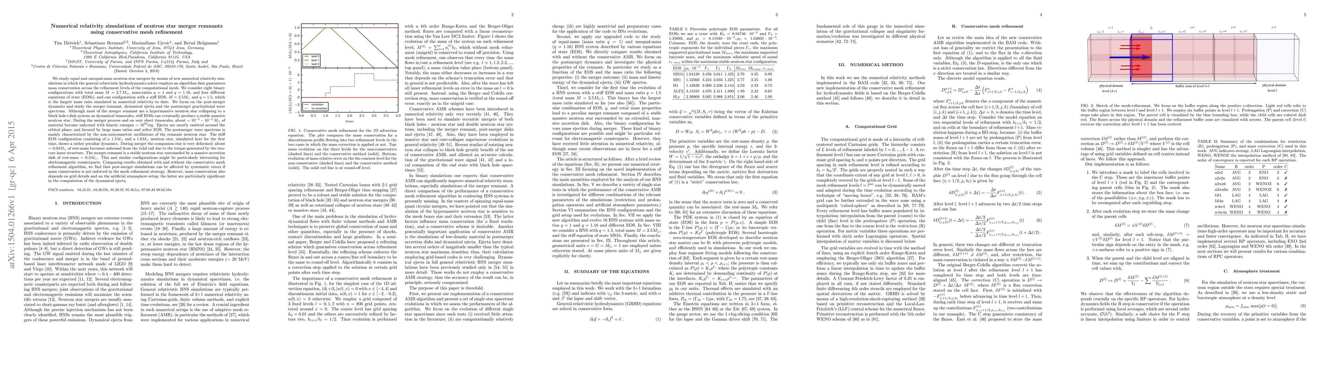 This paper presents numerical relativity simulations of neutron star mergers using a conservative mesh refinement technique to ensure mass conservation. It examines equal and unequal-mass mergers under various equations of state, focusing on post-merger dynamics, remnant formation, and gravitational wave emission. The study finds that most remnants collapse to a black hole, but stiff equations of state can produce stable neutron stars, with ejecta predominantly emitted around the orbital plane.