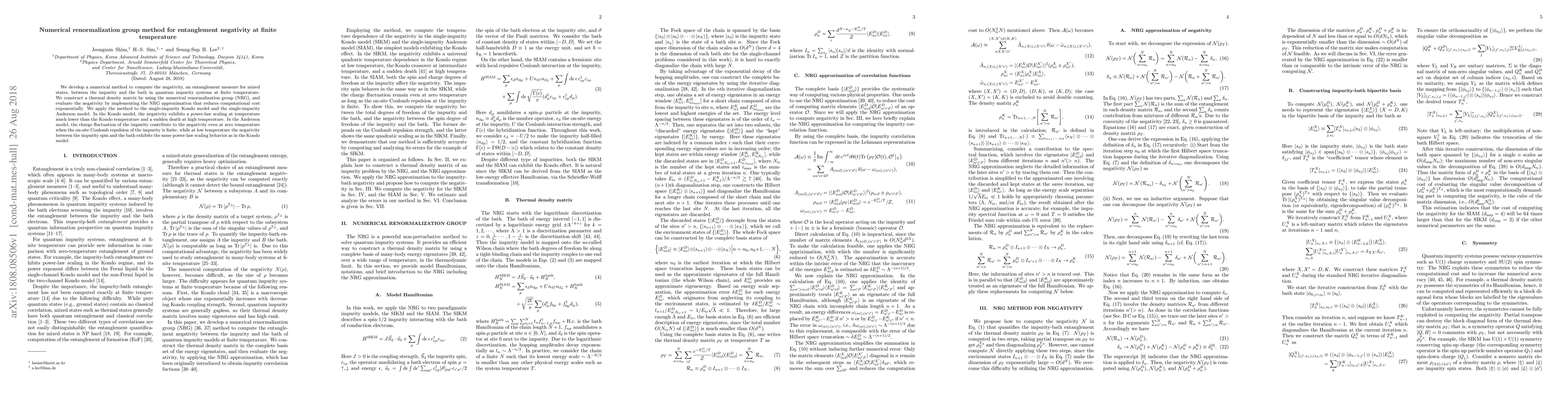 We develop a numerical method to compute the negativity, an entanglement measure for mixed states, between the impurity and the bath in quantum impurity systems at finite temperature. We construct a thermal density matrix by using the numerical renormalization group (NRG), and evaluate the negativity by implementing the NRG approximation that reduces computational cost exponentially. We apply the method to the single-impurity Kondo model and the single-impurity Anderson model. In the Kondo model, the negativity exhibits a power-law scaling at temperature much lower than the Kondo temperature and a sudden death at high temperature. In the Anderson model, the charge fluctuation of the impurity contribute to the negativity even at zero temperature when the on-site Coulomb repulsion of the impurity is finite, while at low temperature the negativity between the impurity spin and the bath exhibits the same power-law scaling behavior as in the Kondo model.