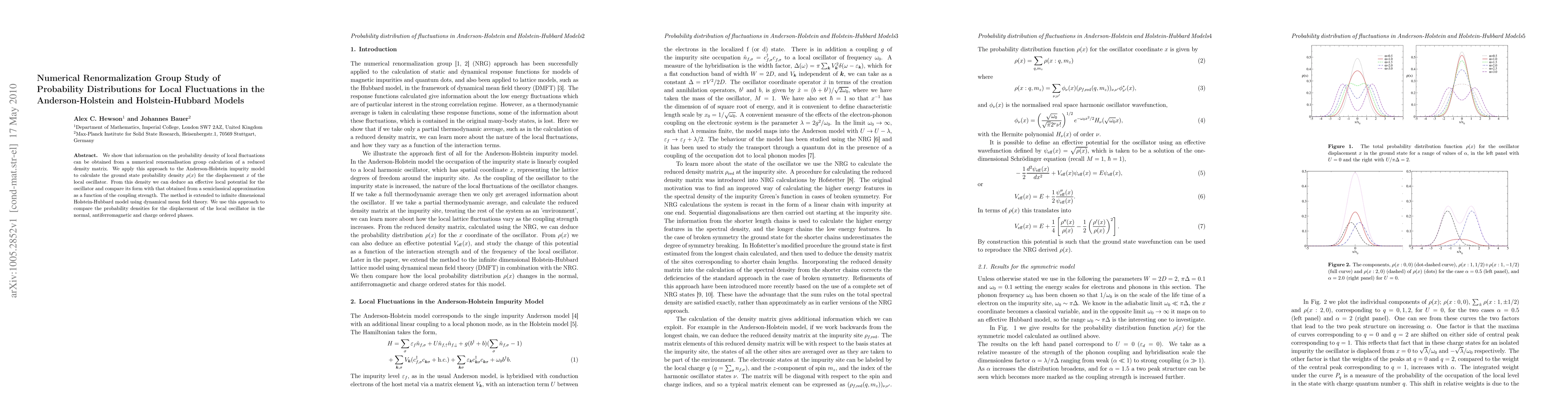 We show that information on the probability density of local fluctuations can be obtained from a numerical renormalisation group calculation of a reduced density matrix. We apply this approach to the Anderson-Holstein impurity model to calculate the ground state probability density $\rho(x)$ for the displacement $x$ of the local oscillator. From this density we can deduce an effective local potential for the oscillator and compare its form with that obtained from a semiclassical approximation as a function of the coupling strength. The method is extended to infinite dimensional Holstein-Hubbard model using dynamical mean field theory. We use this approach to compare the probability densities for the displacement of the local oscillator in the normal, antiferromagnetic and charge ordered phases.