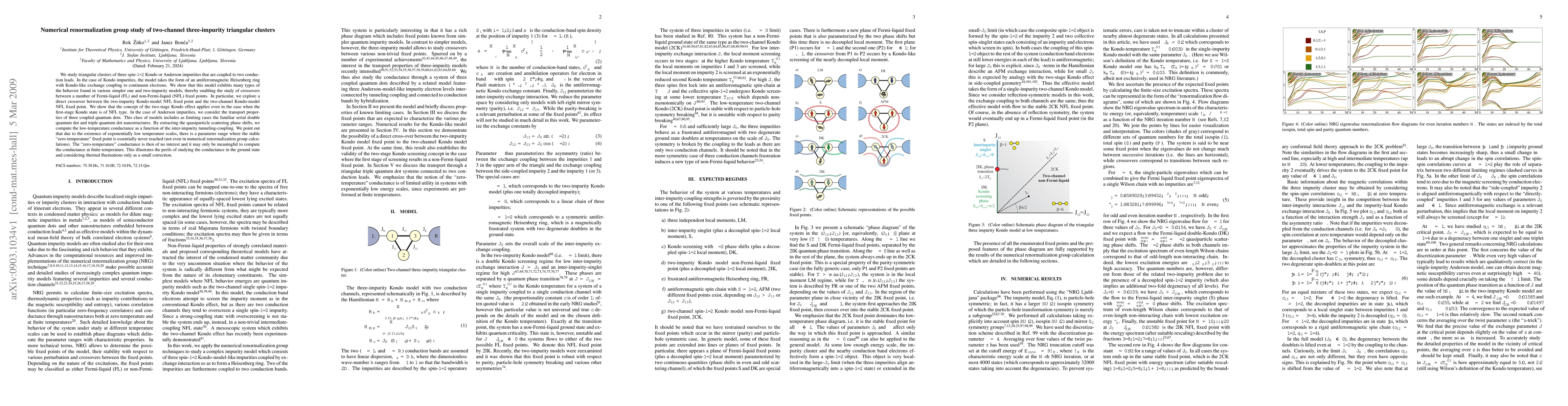 This paper uses numerical renormalization group methods to study triangular clusters of three spin-1/2 Kondo or Anderson impurities connected to two conduction leads. It explores crossovers between Fermi-liquid and non-Fermi-liquid phases, particularly focusing on the two-stage Kondo effect in Kondo impurities and the transport properties in Anderson impurity models, highlighting the significance of finite temperatures over zero-temperature conductance.