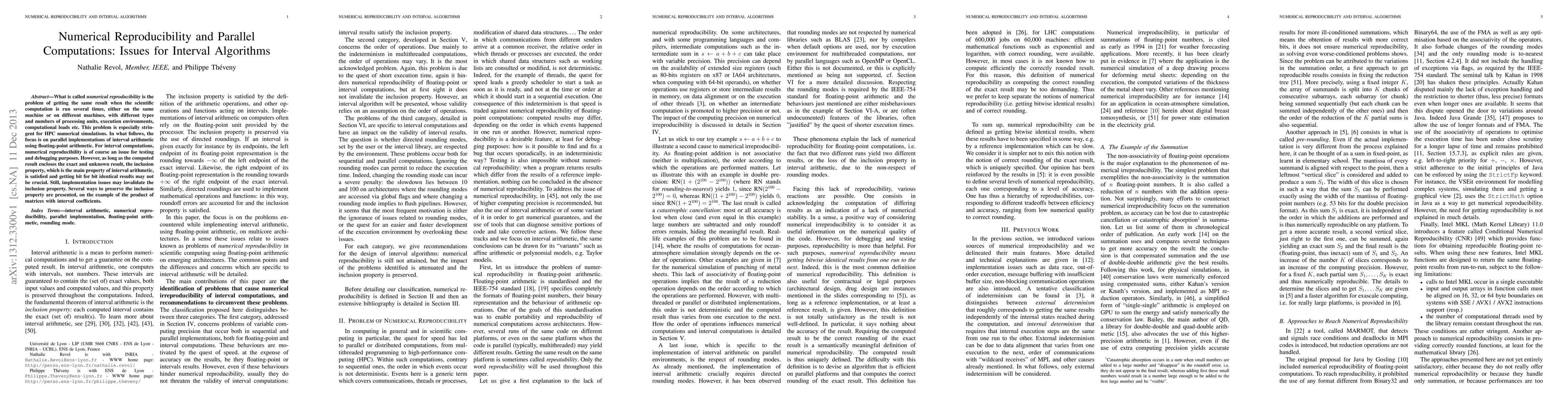 Researchers investigate how to maintain numerical reproducibility in parallel interval arithmetic computations, crucial for high-performance computing simulations. They present methods to preserve the inclusion property of interval arithmetic, ensuring reliable results despite varying execution environments.