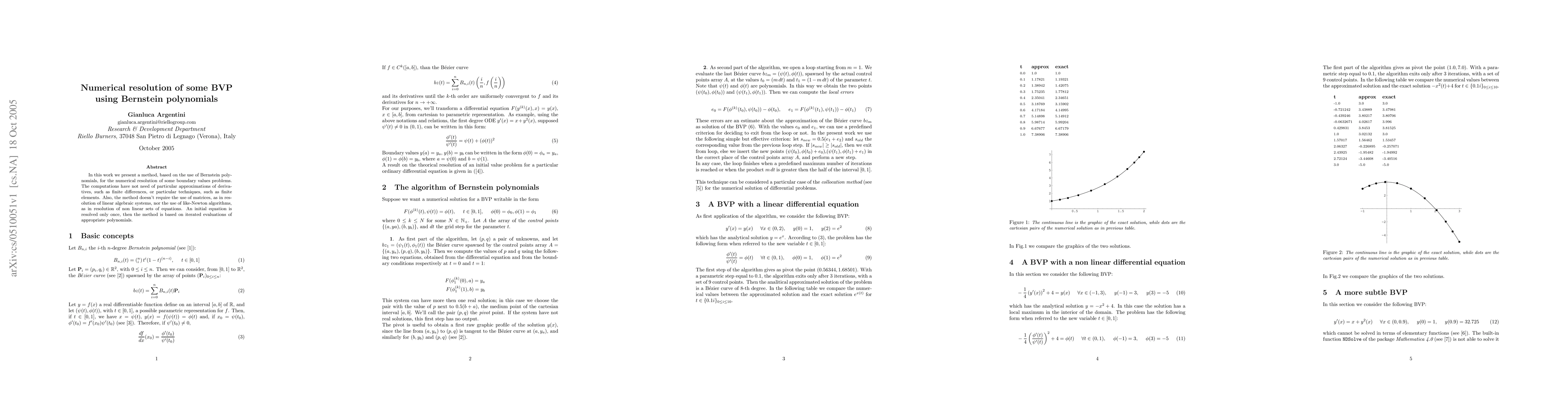 In this work we present a method, based on the use of Bernstein polynomials, for the numerical resolution of some boundary values problems. The computations have not need of particular approximations of derivatives, such as finite differences, or particular techniques, such as finite elements. Also, the method doesn't require the use of matrices, as in resolution of linear algebraic systems, nor the use of like-Newton algorithms, as in resolution of non linear sets of equations. An initial equation is resolved only once, then the method is based on iterated evaluations of appropriate polynomials.