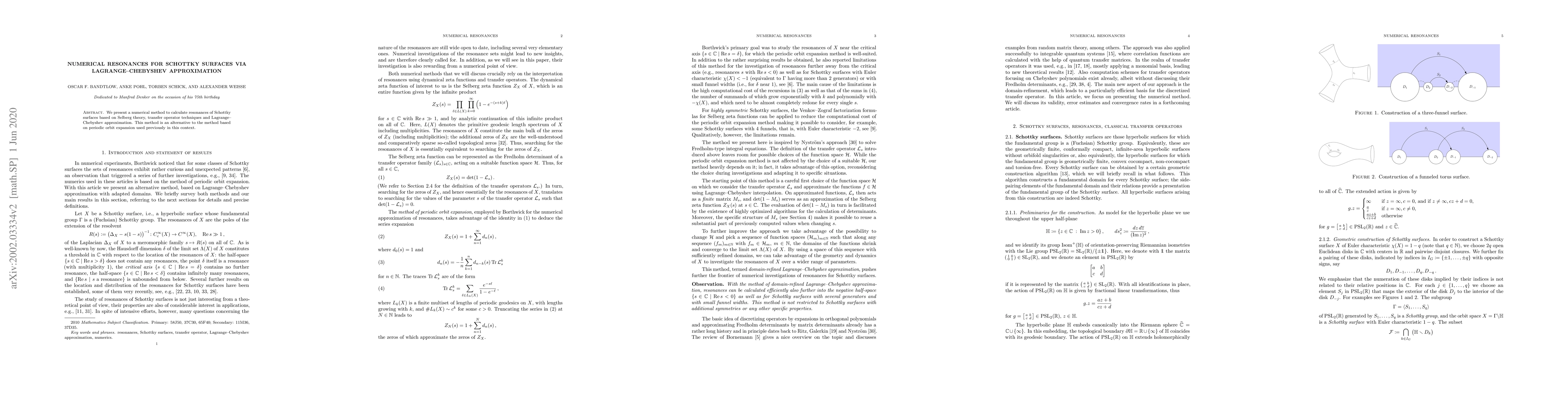 This paper introduces a novel numerical method for calculating resonances of Schottky surfaces, utilizing Selberg theory, transfer operator techniques, and Lagrange-Chebyshev approximation, offering an alternative to the previously used periodic orbit expansion method.