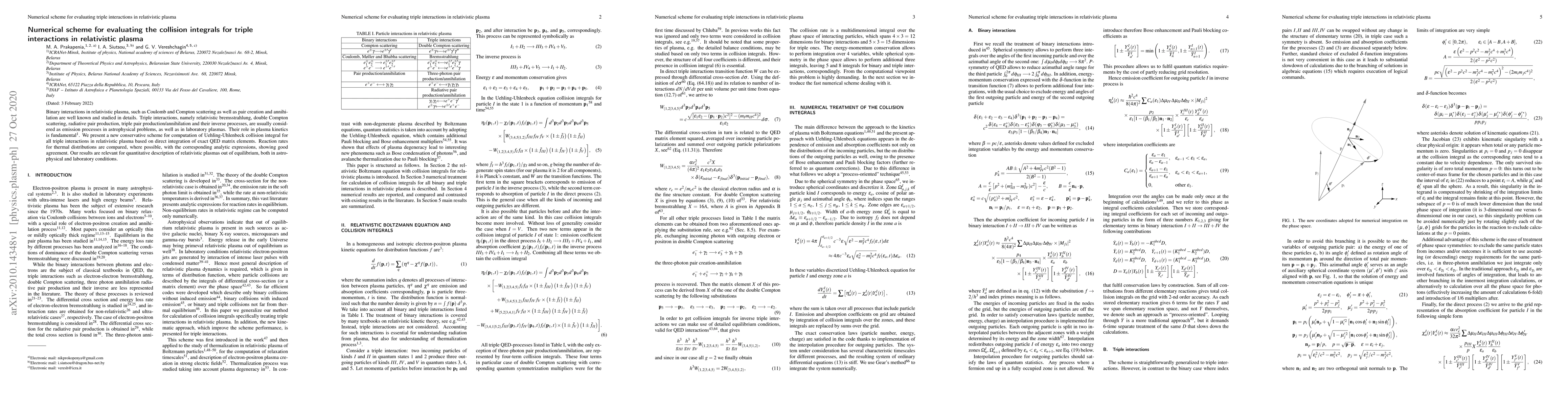 Binary interactions in relativistic plasma, such as Coulomb and Compton scattering as well as pair creation and annihilation are well known and studied in details. Triple interactions, namely relativistic bremsstrahlung, double Compton scattering, radiative pair production, triple pair production/annihilation and their inverse processes, are usually considered as emission processes in astrophysical problems, as well as in laboratory plasmas. Their role in plasma kinetics is fundamental [1]. We present a new conservative scheme for computation of Uehling-Uhlenbeck collision integral for all triple interactions in relativistic plasma based on direct integration of exact QED matrix elements. Reaction rates for thermal distributions are compared, where possible, with the corresponding analytic expressions, showing good agreement. Our results are relevant for quantitative description of relativistic plasmas out of equilibrium, both in astrophysical and laboratory conditions.