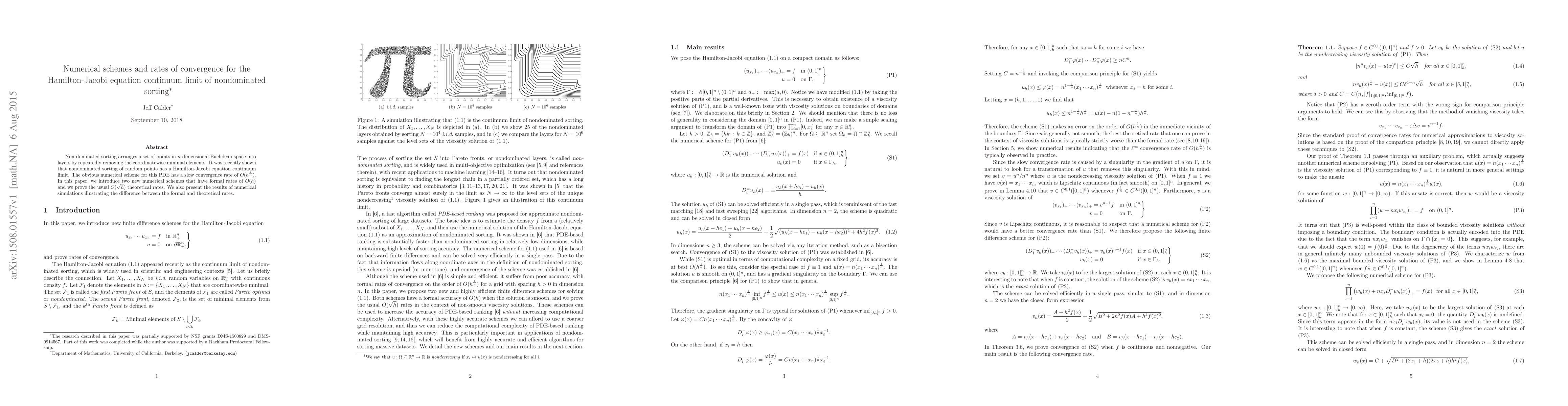 This paper introduces two new numerical schemes for solving the Hamilton-Jacobi equation continuum limit of nondominated sorting, achieving formal convergence rates of O(h) and proving the traditional O(h^1/2) theoretical rates. The study also compares formal and theoretical rates through numerical simulations.