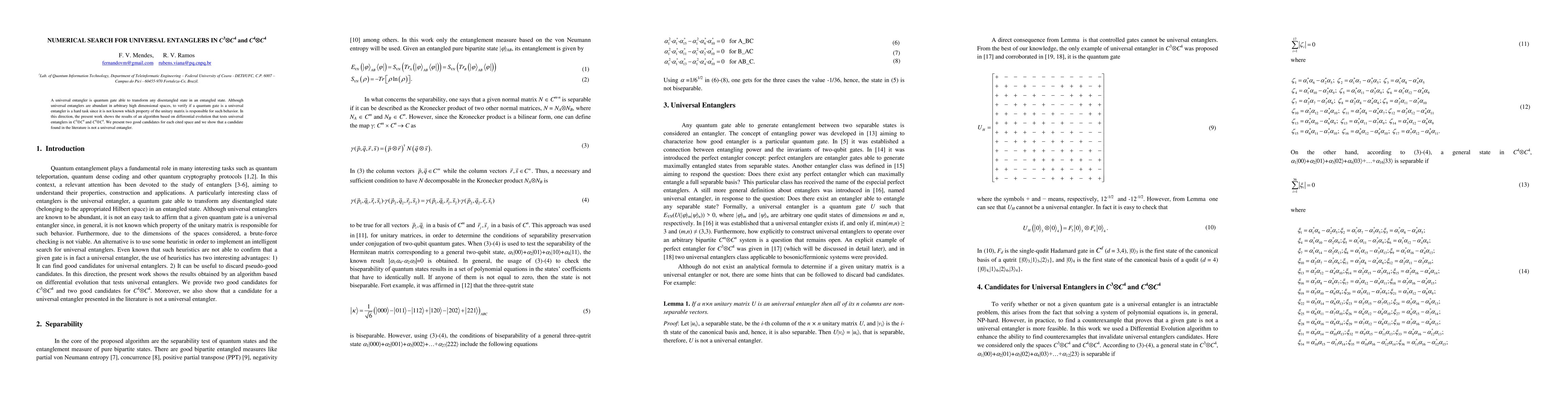 This paper presents an algorithm using differential evolution to search for universal entanglers in C3xC4 and C4xC4 quantum gate spaces. It identifies two promising candidates for each space and disproves the universality of a previously proposed candidate.