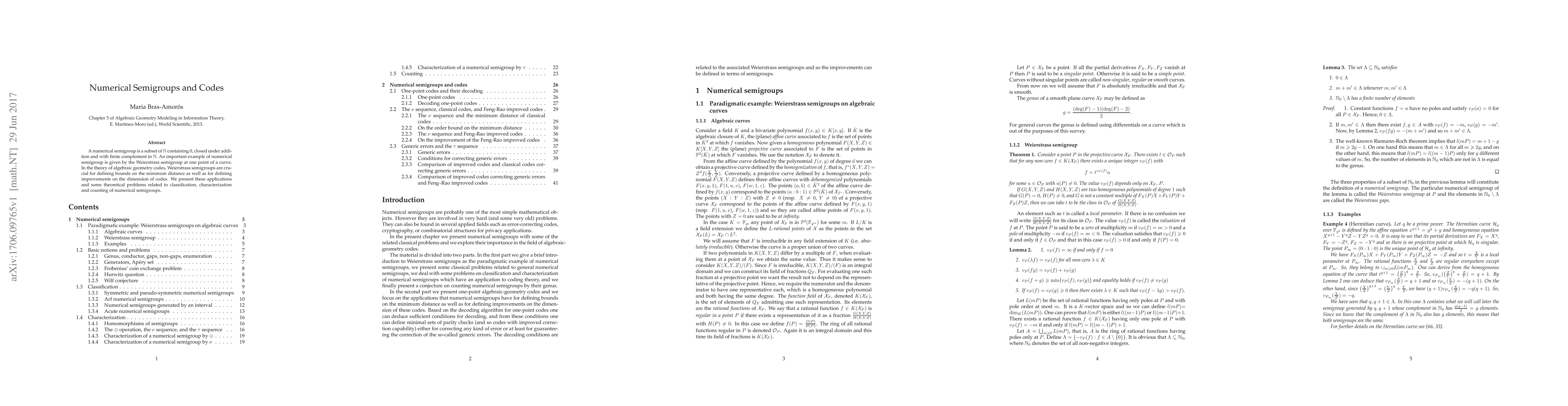 A numerical semigroup is a subset of N containing 0, closed under addition and with finite complement in N. An important example of numerical semigroup is given by the Weierstrass semigroup at one point of a curve. In the theory of algebraic geometry codes, Weierstrass semigroups are crucial for defining bounds on the minimum distance as well as for defining improvements on the dimension of codes. We present these applications and some theoretical problems related to classification, characterization and counting of numerical semigroups.