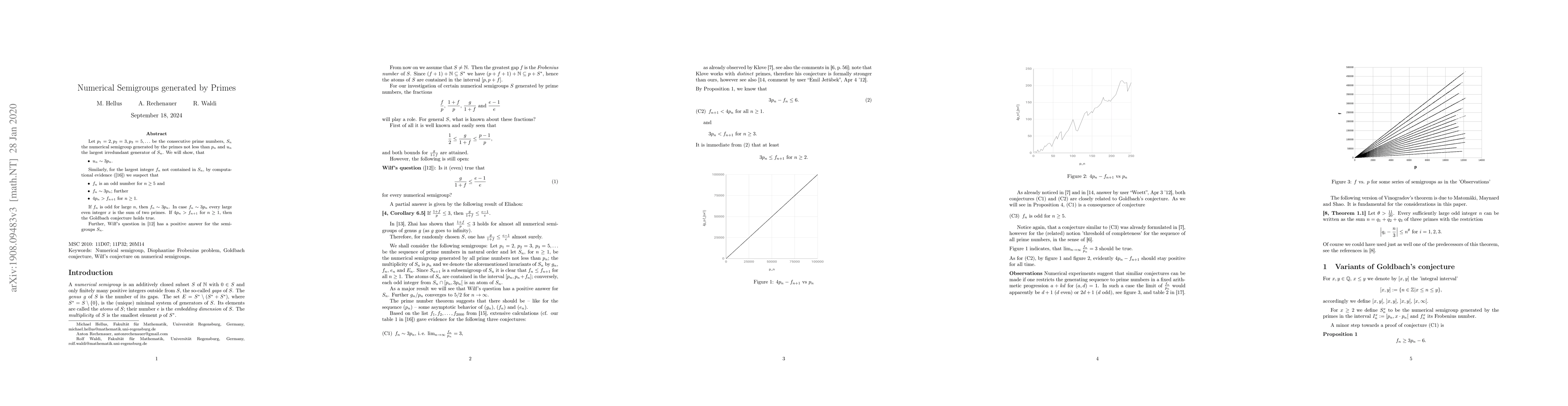 Let $p_1=2, p_2=3, p_3=5, \ldots$ be the consecutive prime numbers, $S_n$ the numerical semigroup generated by the primes not less than $p_n$ and $u_n$ the largest irredundant generator of $S_n$. We will show, that $\bullet$ $u_n\sim3p_n$. Similarly, for the largest integer $f_n$ not contained in $S_n$, by computational evidence we suspect that $\bullet$ $f_n$ is an odd number for $n\geq5$ and $\bullet$ $f_n\sim3p_n$; further $\bullet$ $4p_n>f_{n+1}$ for $n\geq1$. If $f_n$ is odd for large $n$, then $f_n\sim3p_n$. In case $f_n\sim3p_n$ every large even integer $x$ is the sum of two primes. If $4p_n>f_{n+1}$ for $n\geq1$, then the Goldbach conjecture holds true. Further, Wilf's question in [12] has a positive answer for the semigroups $S_n$.