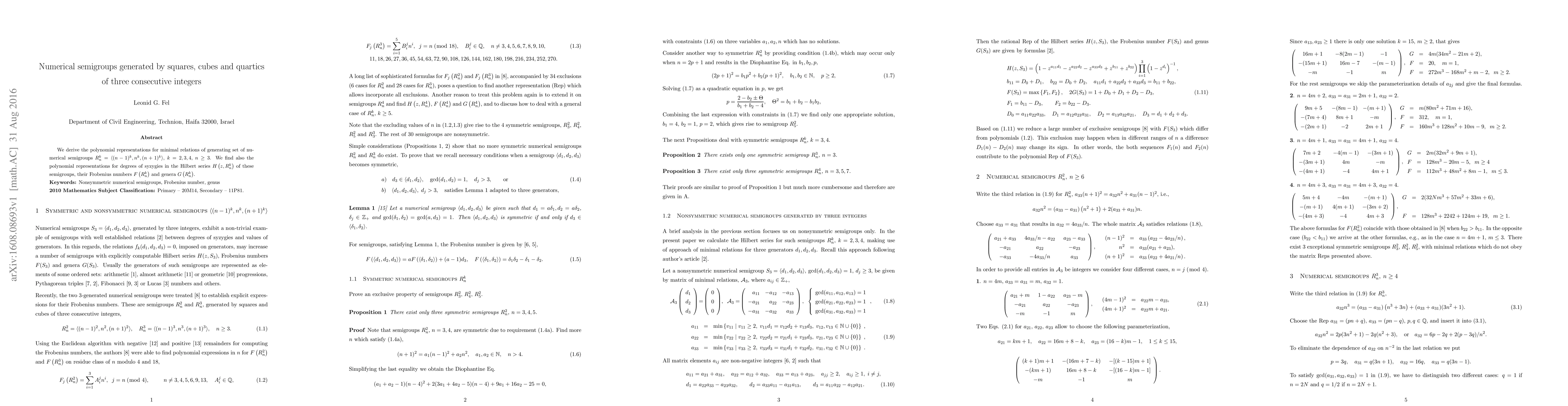 We derive the polynomial representations for minimal relations of generating set of numerical semigroups R_n^k=<(n-1)^k,n^k,(n+1)^k>, k=2,3,4, n>2. We find also the polynomial representations for degrees of syzygies in the Hilbert series H(z,R_n^k) of these semigroups, their Frobenius numbers F(R_n^k) and genera G(R_n^k).