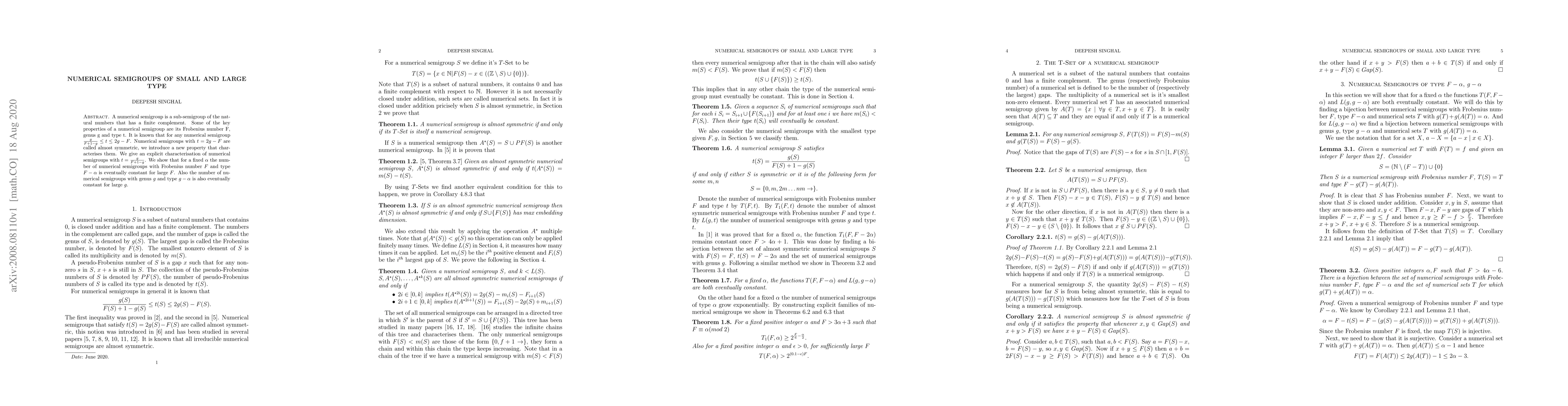 Numerical semigroups with specific properties have been studied, including those with type t equal to g-F and those with a constant number of semigroups for large values of F and g.