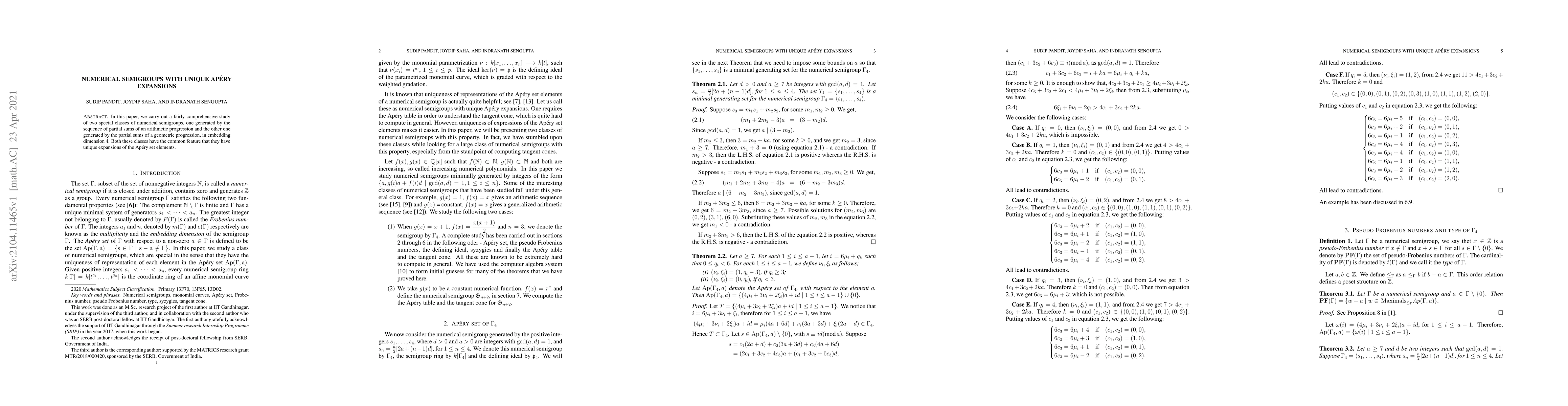 This paper investigates two specific types of numerical semigroups in embedding dimension 4, generated by arithmetic and geometric progressions, which uniquely expand elements of the Apéry set. The study highlights the unique properties of these semigroups.