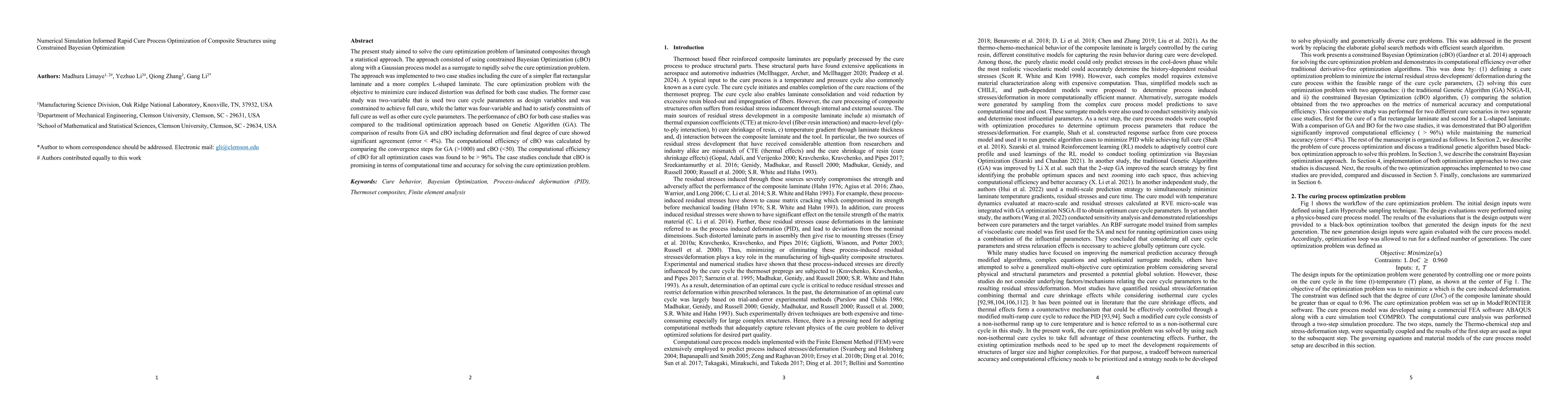 This study introduces Constrained Bayesian Optimization (cBO) for optimizing the curing process of composite structures, significantly reducing computational time compared to Genetic Algorithm (GA) with minimal accuracy loss. Case studies on flat and L-shaped laminates demonstrated cBO's effectiveness, achieving over 96% computational efficiency.