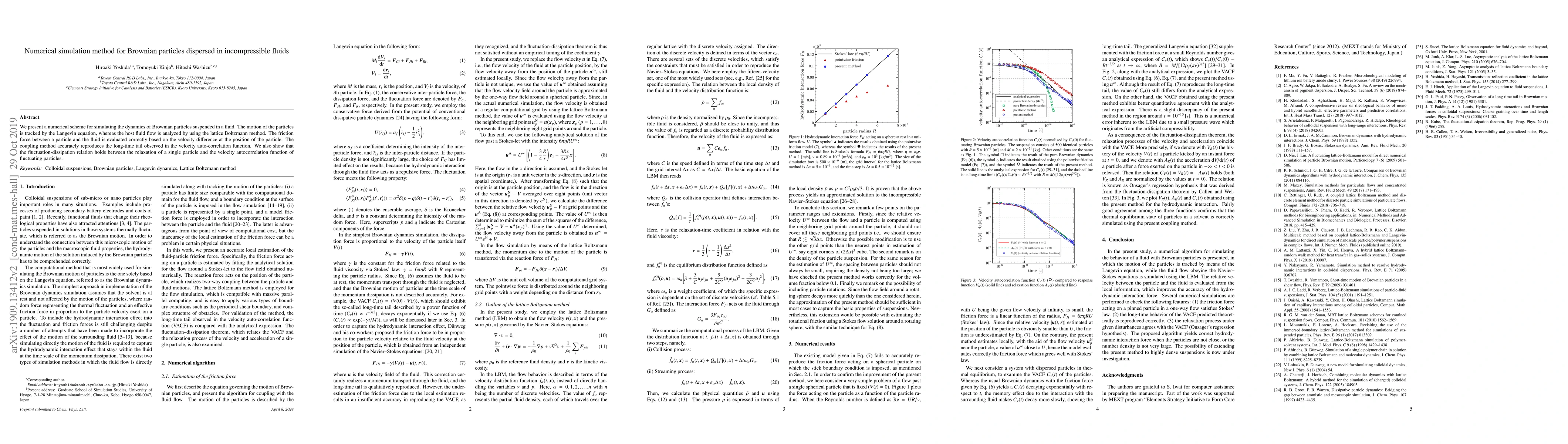 This paper introduces a numerical scheme to simulate Brownian particles in incompressible fluids, employing the Langevin equation for particle motion and the lattice Boltzmann method for fluid dynamics. The method accurately captures the long-time tail in velocity auto-correlation and validates the fluctuation-dissipation relation.