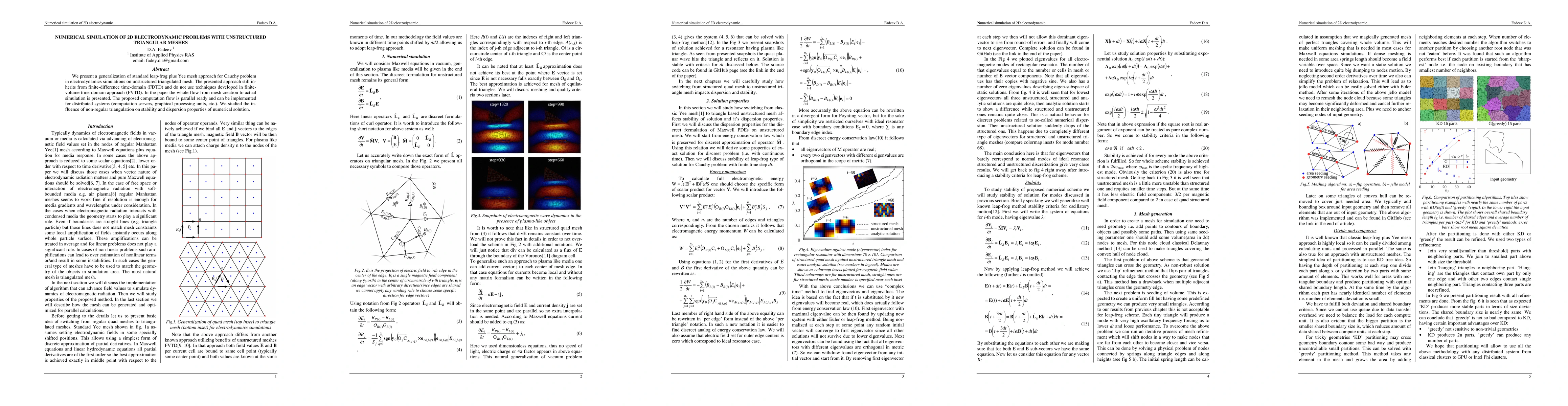 We present a generalization of standard Yee approach for Cauchy problem in electrodynamic simulations on unstructured triangulated mesh. In the paper the whole flow from mesh creation to actual simulation is presented. The proposed computation flow is parallel ready and can be implemented for distributed systems (computation servers, GPU-s, etc.). We studied the influence of non-regular triangulation on stability and dispersion properties of numerical solution.