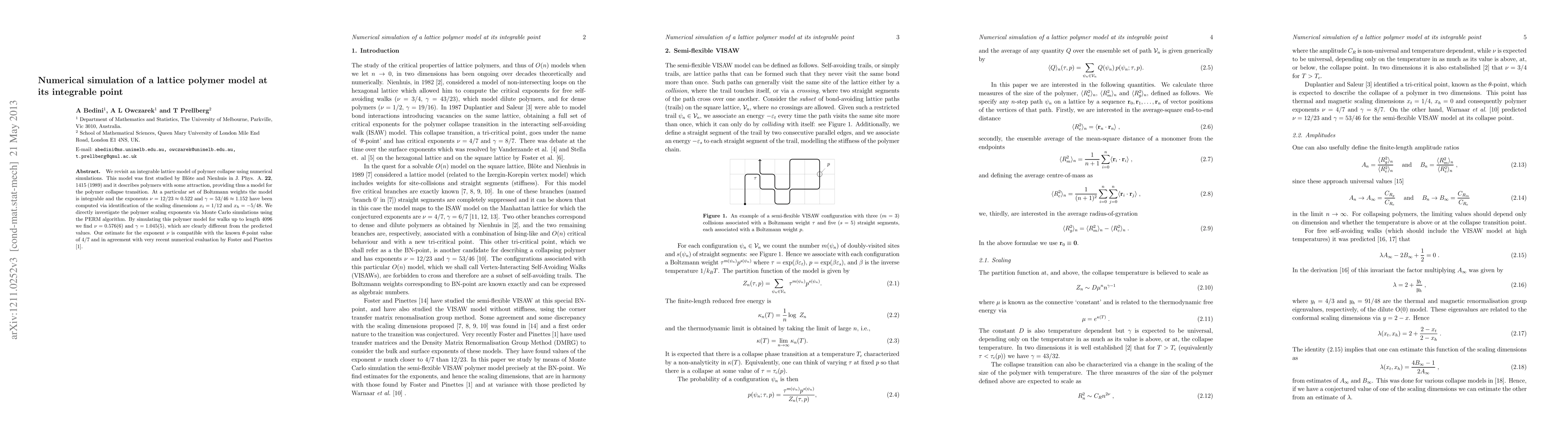 We revisit an integrable lattice model of polymer collapse using numerical simulations. This model was first studied by Bl\"ote and Nienhuis in J. Phys. A. {\bf 22}, 1415 (1989) and it describes polymers with some attraction, providing thus a model for the polymer collapse transition. At a particular set of Boltzmann weights the model is integrable and the exponents $\nu=12/23\approx 0.522$ and $\gamma=53/46\approx 1.152$ have been computed via identification of the scaling dimensions $x_t=1/12$ and $x_h=-5/48$. We directly investigate the polymer scaling exponents via Monte Carlo simulations using the PERM algorithm. By simulating this polymer model for walks up to length 4096 we find $\nu=0.576(6)$ and $\gamma=1.045(5)$, which are clearly different from the predicted values. Our estimate for the exponent $\nu$ is compatible with the known $\theta$-point value of 4/7 and in agreement with very recent numerical evaluation by Foster and Pinettes.