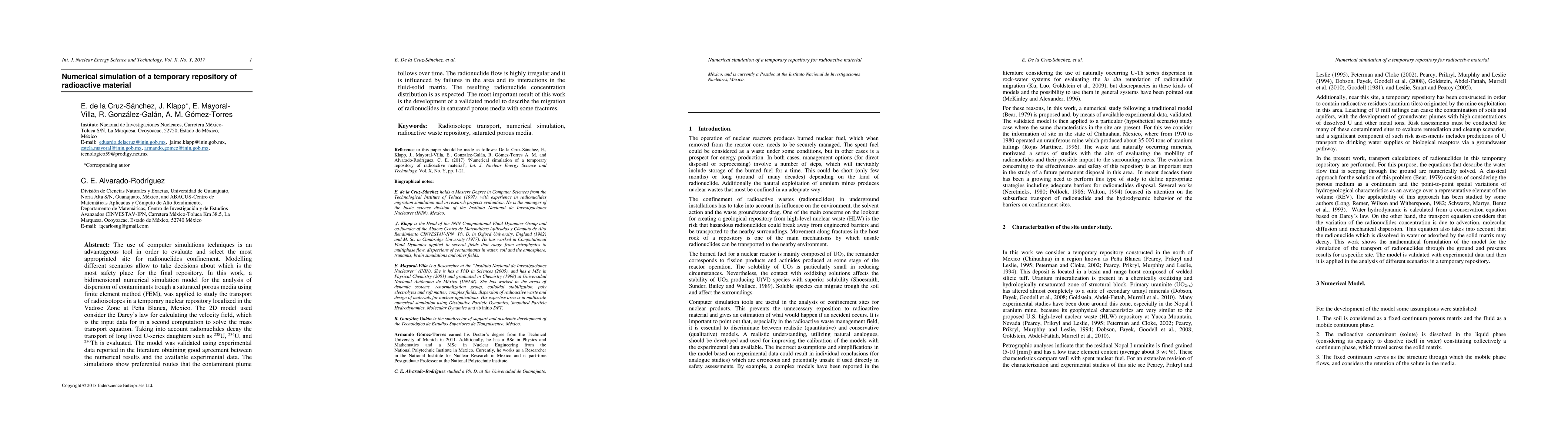 The use of computer simulations techniques is an advantageous tool in order to evaluate and select the most appropriated site for radionuclides confinement. Modelling different scenarios allow to take decisions about which is the most safety place for the final repository. In this work, a bidimensional numerical simulation model for the analysis of dispersion of contaminants trough a saturated porous media using finite element method (FEM), was applied to study the transport of radioisotopes in a temporary nuclear repository localized in the Vadose Zone at Pe\~na Blanca, M\'exico. The 2D model used consider the Darcy's law for calculating the velocity field, which is the input data for in a second computation to solve the mass transport equation. Taking into account radionuclides decay the transport of long lived U-series daughters such as ${}^{238}\!\text{U}$, ${}^{234}\!\text{U}$, and ${}^{230}\!\text{Th}$ is evaluated. The model was validated using experimental data reported in the literature obtaining good agreement between the numerical results and the available experimental data. The simulations show preferential routes that the contaminant plume follows over time. The radionuclide flow is highly irregular and it is influenced by failures in the area and its interactions in the fluid-solid matrix. The resulting radionuclide concentration distribution is as expected. The most important result of this work is the development of a validated model to describe the migration of radionuclides in saturated porous media with some fractures.