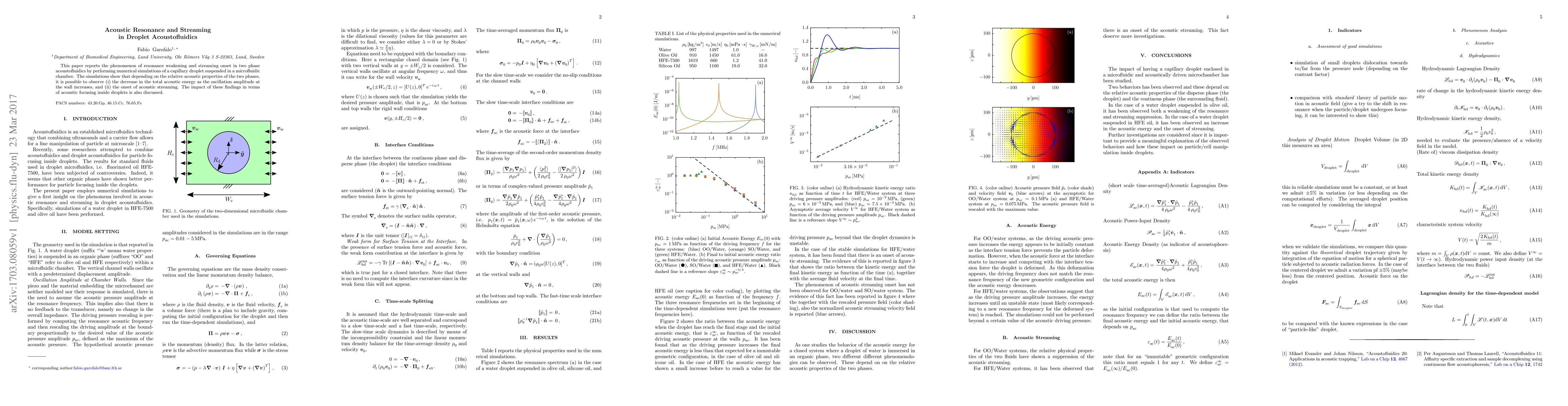 This paper reports the phenomenon of resonance weakening and streaming onset in two phase acoustofluidics by performing numerical simulations of a capillary droplet suspended in a microfluidic chamber. The simulations show that depending on the relative acoustic properties of the two phases, it is possible to observe (i)~the decrease in the total acoustic energy as the oscillation amplitude at the wall increases, and (ii)~the onset of acoustic streaming. The impact of these findings in terms of acoustic focusing inside droplets is also discussed.