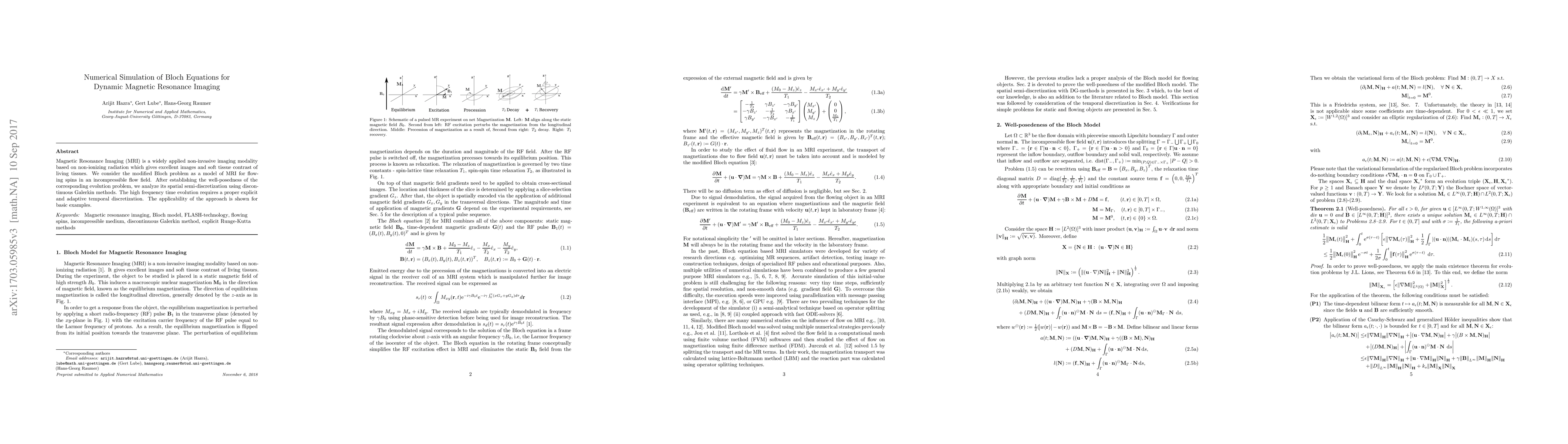 Magnetic Resonance Imaging (MRI) is a widely applied non-invasive imaging modality based on non-ionizing radiation which gives excellent images and soft tissue contrast of living tissues. We consider the modified Bloch problem as a model of MRI for flowing spins in an incompressible flow field. After establishing the well-posedness of the corresponding evolution problem, we analyze its spatial semidiscretization using discontinuous Galerkin methods. The high frequency time evolution requires a proper explicit and adaptive temporal discretization. The applicability of the approach is shown for basic examples.