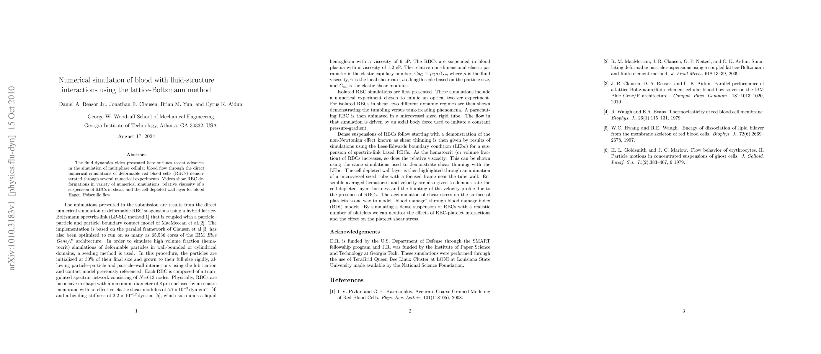 This paper presents numerical simulations of blood flow using the lattice-Boltzmann method, focusing on fluid-structure interactions with deformable red blood cells. The study demonstrates RBC deformations, relative viscosity in shear, and cell-depleted wall layers in Hagen-Poiseuille flow.