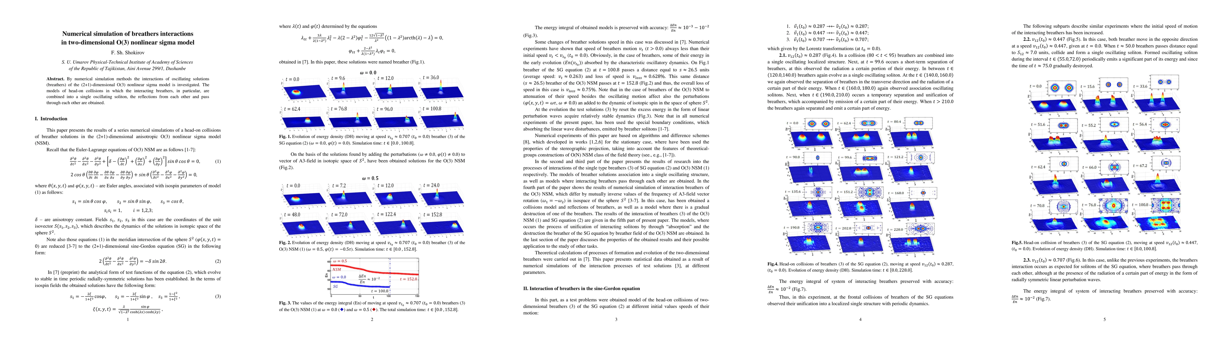 This paper uses numerical simulations to study the interactions of breathers in a two-dimensional O(3) nonlinear sigma model, focusing on head-on collisions and their resultant oscillating solitons. The research reveals how breathers reflect and pass through each other during interactions.