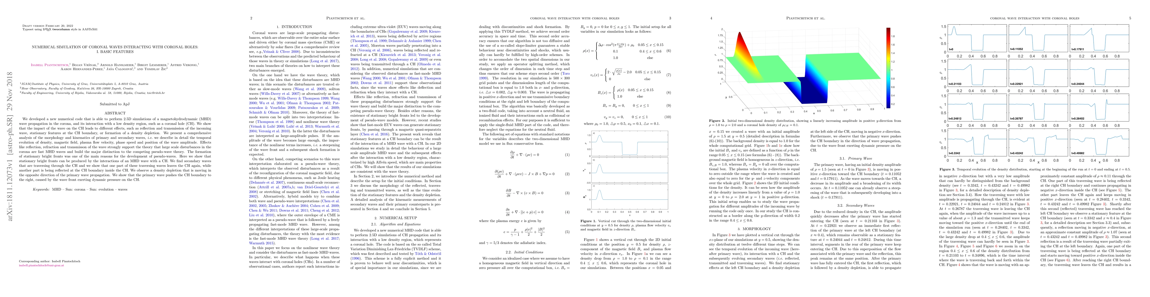 Researchers developed a numerical model to simulate coronal waves interacting with coronal holes, finding that these interactions can lead to wave reflection, transmission, and the formation of stationary bright fronts, supporting the theory of fast MHD waves.