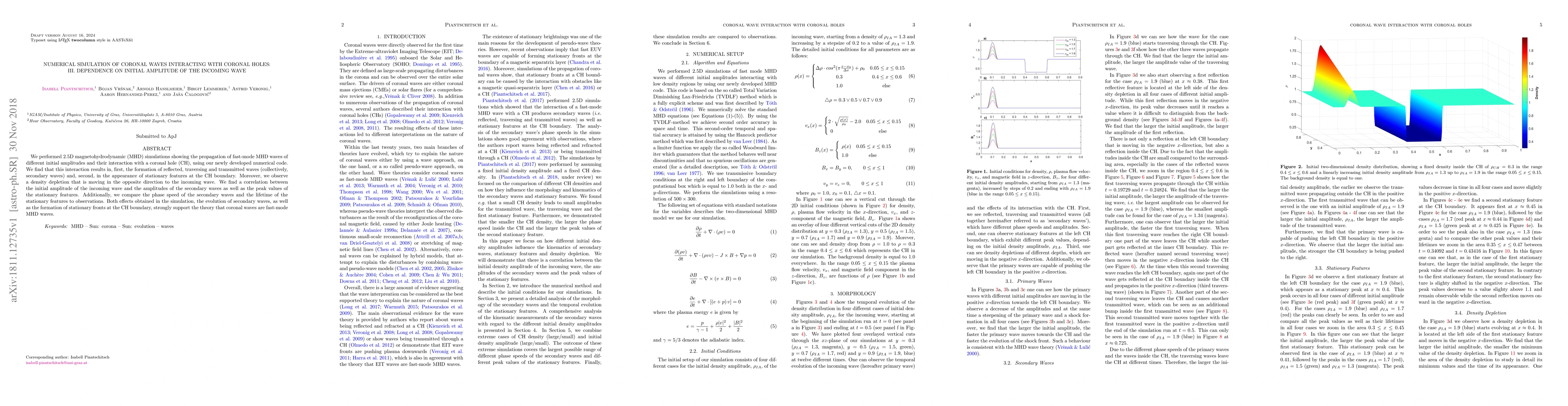 We performed 2.5D magnetohydrodynamic (MHD) simulations showing the propagation of fast-mode MHD waves of different initial amplitudes and their interaction with a coronal hole (CH), using our newly developed numerical code. We find that this interaction results in, first, the formation of reflected, traversing and transmitted waves (collectively, secondary waves) and, second, in the appearance of stationary features at the CH boundary. Moreover, we observe a density depletion that is moving in the opposite direction to the incoming wave. We find a correlation between the initial amplitude of the incoming wave and the amplitudes of the secondary waves as well as the peak values of the stationary features. Additionally, we compare the phase speed of the secondary waves and the lifetime of the stationary features to observations. Both effects obtained in the simulation, the evolution of secondary waves, as well as the formation of stationary fronts at the CH boundary, strongly support the theory that coronal waves are fast-mode MHD waves.