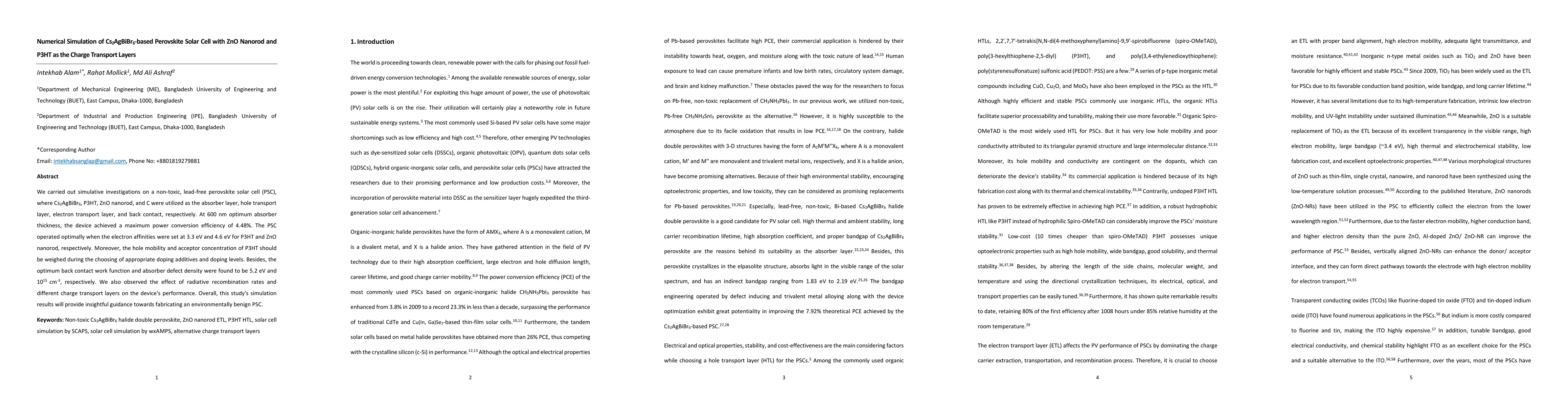 This paper simulates a non-toxic, lead-free perovskite solar cell using Cs2AgBiBr6 as the absorber layer, P3HT as the hole transport layer, ZnO nanorods for electron transport, and carbon as the back contact. The optimal configuration achieved a power conversion efficiency of 4.48%, highlighting the importance of material properties and doping levels for performance enhancement.