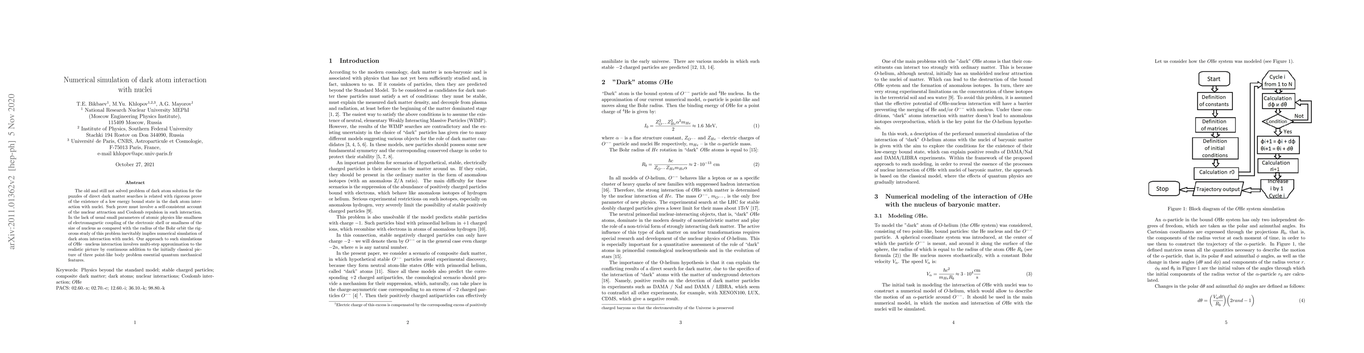 Researchers conducted a numerical simulation to study dark atom interaction with nuclei, aiming to prove the existence of a low-energy bound state. Their approach used a multi-step approximation method to incorporate quantum mechanical features into a classical three-body problem model.