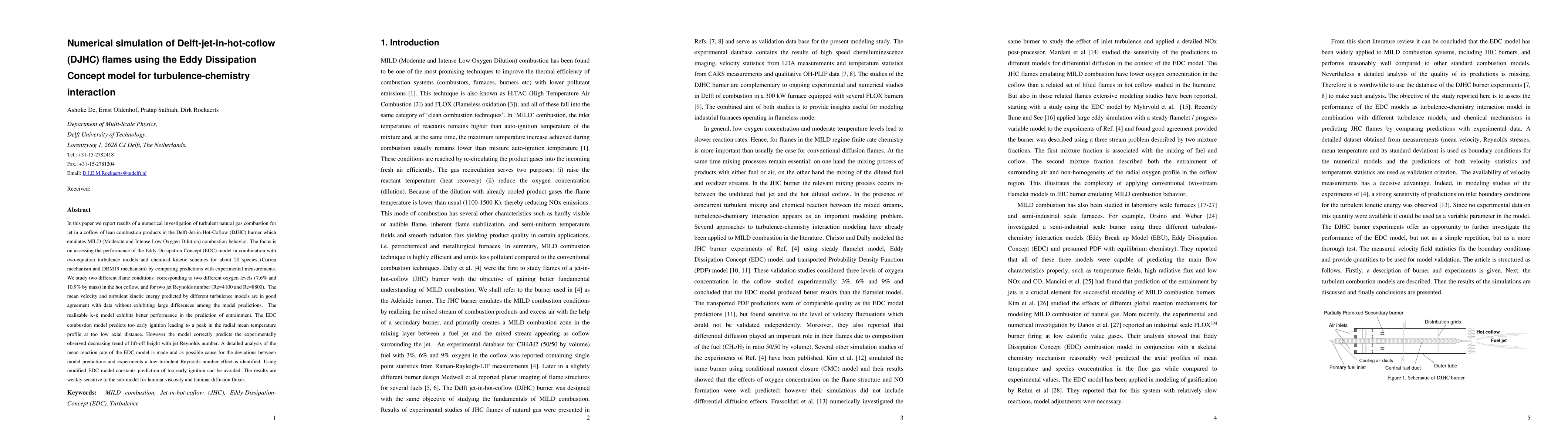 In this paper we report results of a numerical investigation of turbulent natural gas combustion for jet in a coflow of lean combustion products in the Delft-Jet-in-Hot-Coflow (DJHC) burner which emulates MILD (Moderate and Intense Low Oxygen Dilution) combustion behavior. The focus is on assessing the performance of the Eddy Dissipation Concept (EDC) model in combination with two-equation turbulence models and chemical kinetic schemes for about 20 species (Correa mechanism and DRM19 mechanism) by comparing predictions with experimental measurements. We study two different flame conditions corresponding to two different oxygen levels (7.6% and 10.9% by mass) in the hot coflow, and for two jet Reynolds number (Re=4100 and Re=8800). The mean velocity and turbulent kinetic energy predicted by different turbulence models are in good agreement with data without exhibiting large differences among the model predictions. The realizable k-e model exhibits better performance in the prediction of entrainment. The EDC combustion model predicts too early ignition leading to a peak in the radial mean temperature profile at too low axial distance. However the model correctly predicts the experimentally observed decreasing trend of lift-off height with jet Reynolds number. A detailed analysis of the mean reaction rate of the EDC model is made and as possible cause for the deviations between model predictions and experiments a low turbulent Reynolds number effect is identified. Using modified EDC model constants prediction of too early ignition can be avoided. The results are weakly sensitive to the sub-model for laminar viscosity and laminar diffusion fluxes.