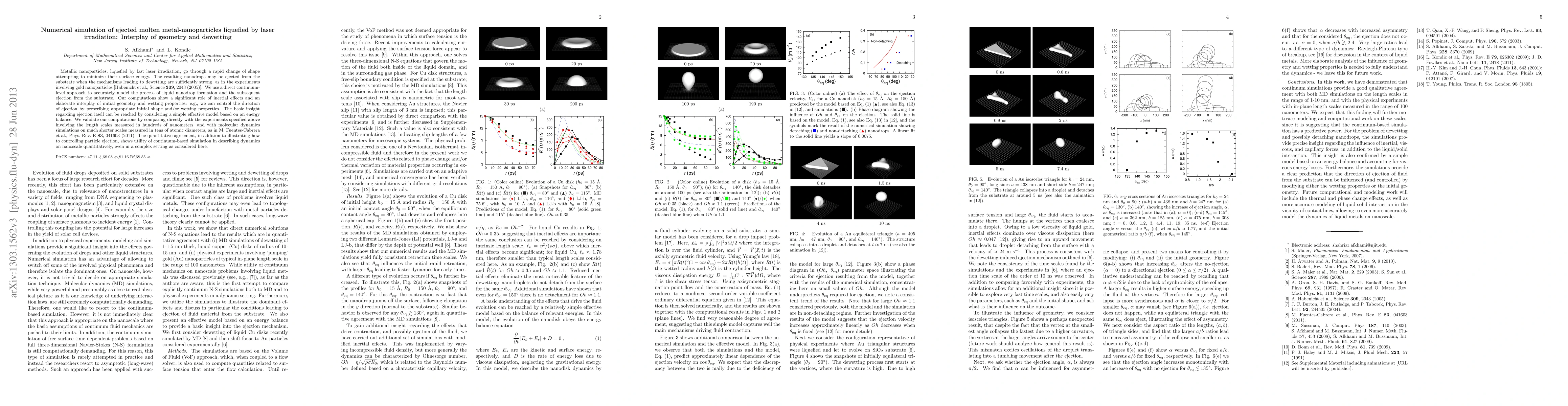 Metallic nanoparticles, liquefied by fast laser irradiation, go through a rapid change of shape attempting to minimize their surface energy. The resulting nanodrops may be ejected from the substrate when the mechanisms leading to dewetting are sufficiently strong, as in the experiments involving gold nanoparticles [Habenicht et al., Science 309, 2043 (2005)]. We use a direct continuum-level approach to accurately model the process of liquid nanodrop formation and the subsequent ejection from the substrate. Our computations show a significant role of inertial effects and an elaborate interplay of initial geometry and wetting properties: e.g., we can control the direction of ejection by prescribing appropriate initial shape and/or wetting properties. The basic insight regarding ejection itself can be reached by considering a simple effective model based on an energy balance. We validate our computations by comparing directly with the experiments specified above involving the length scales measured in hundreds of nanometers, and with molecular dynamics simulations on much shorter scales measured in tens of atomic diameters, as in [M. Fuentes-Cabrera et al., Phys. Rev. E 83, 041603 (2011)]. The quantitative agreement, in addition to illustrating how to controlling particle ejection, shows utility of continuum-based simulation in describing dynamics on nanoscale quantitatively, even in a complex setting as considered here.